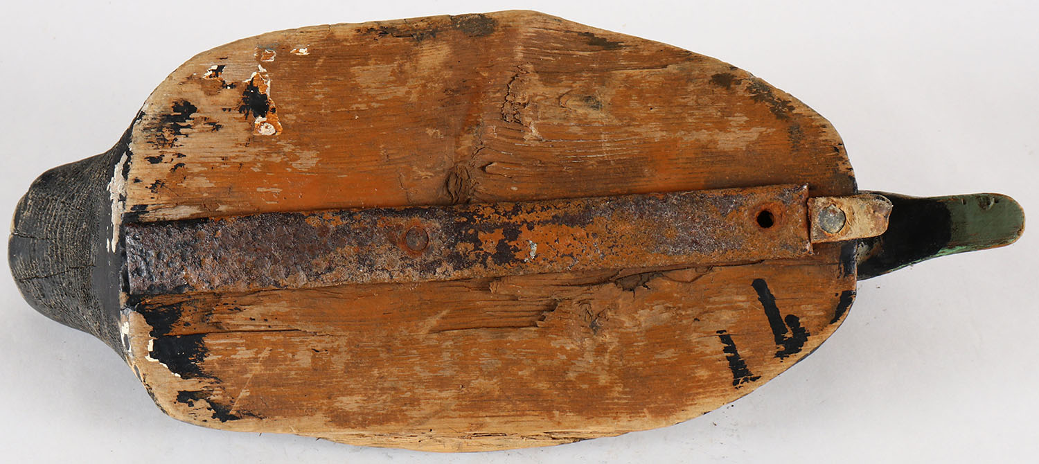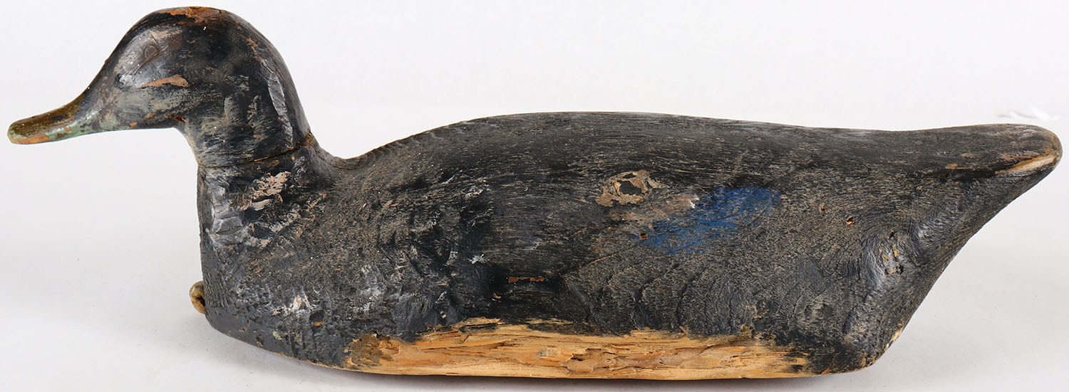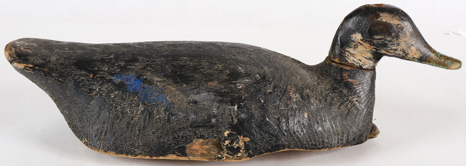 Black Duck by unknown maker, no eyes, solid wood, original paint, shows wood chips. Grade: Very Good - Value: 10 to 30