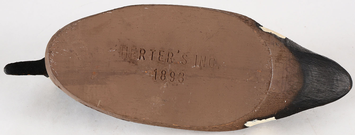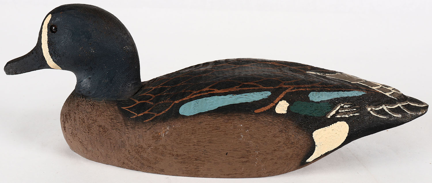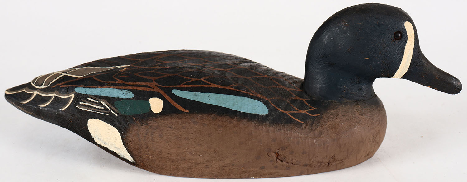 Bluewing Teal Drake by Herters Decoy Co., Waseca, MN, 1893 series, glass eyes, solid wood, original paint, structurally excellent, marked on bottom. Grade: Excellent ++ - Value: 50 to 100
