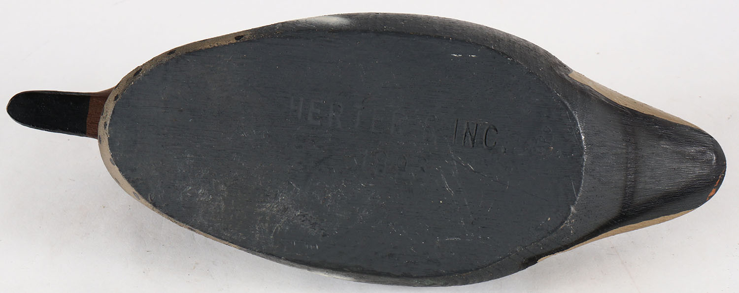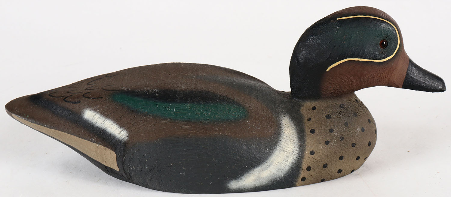 Greenwing Teal Drake by Herters Decoy Co., Waseca, MN, 1893 series, glass eyes, solid wood, original paint, structurally excellent, marked on bottom. Grade: Excellent ++ - Value: 50 to 100