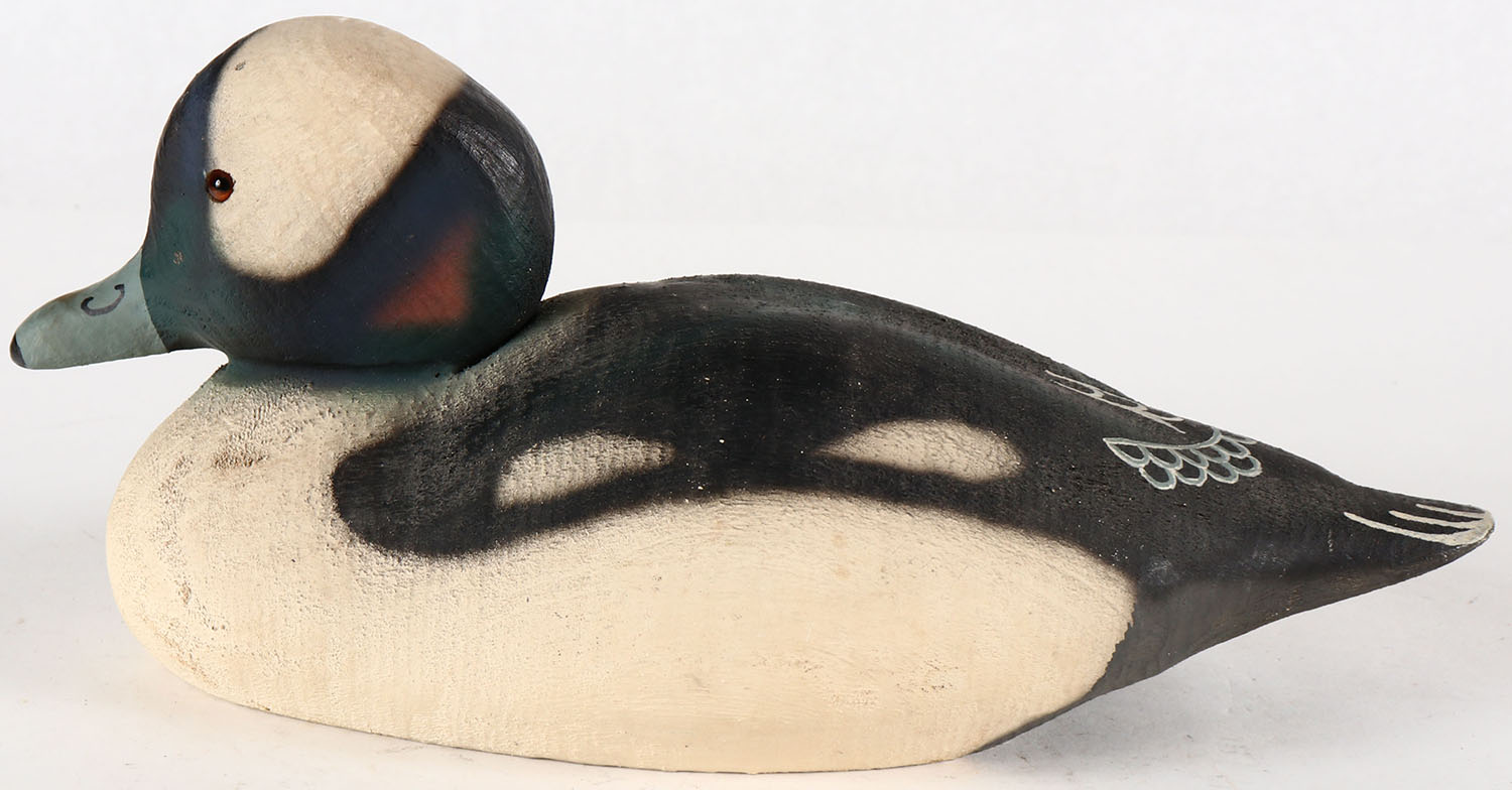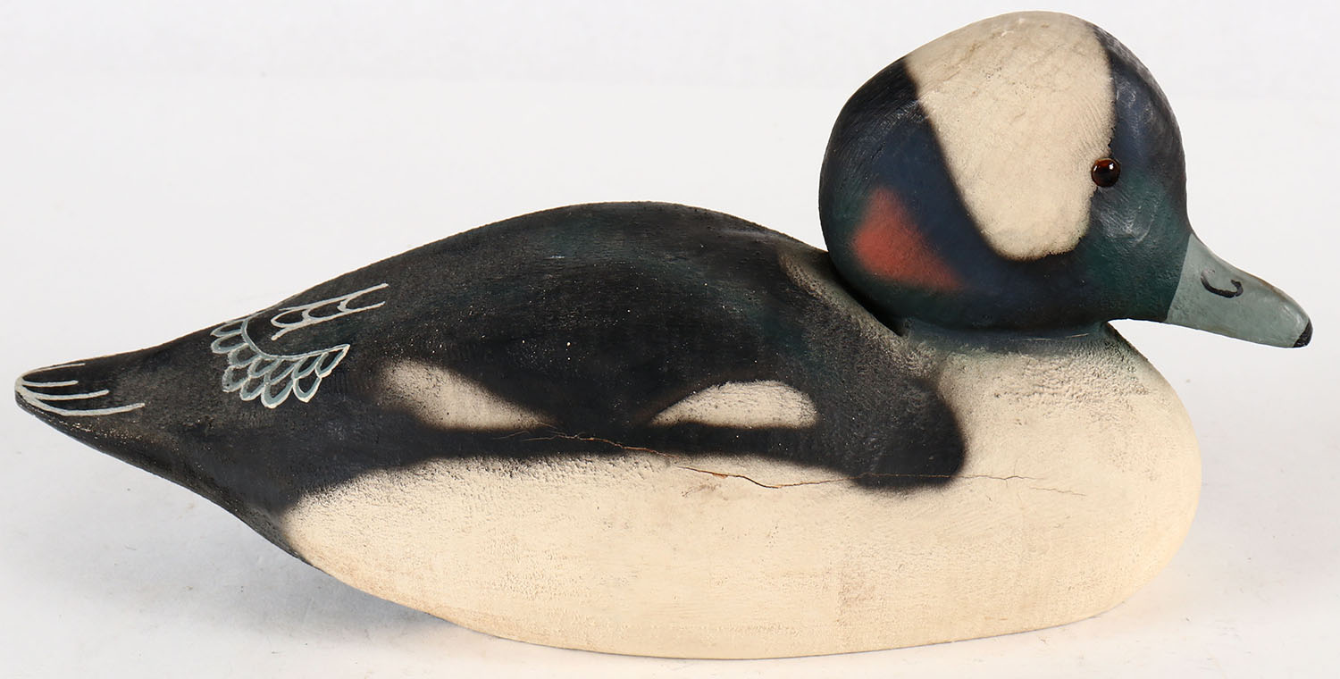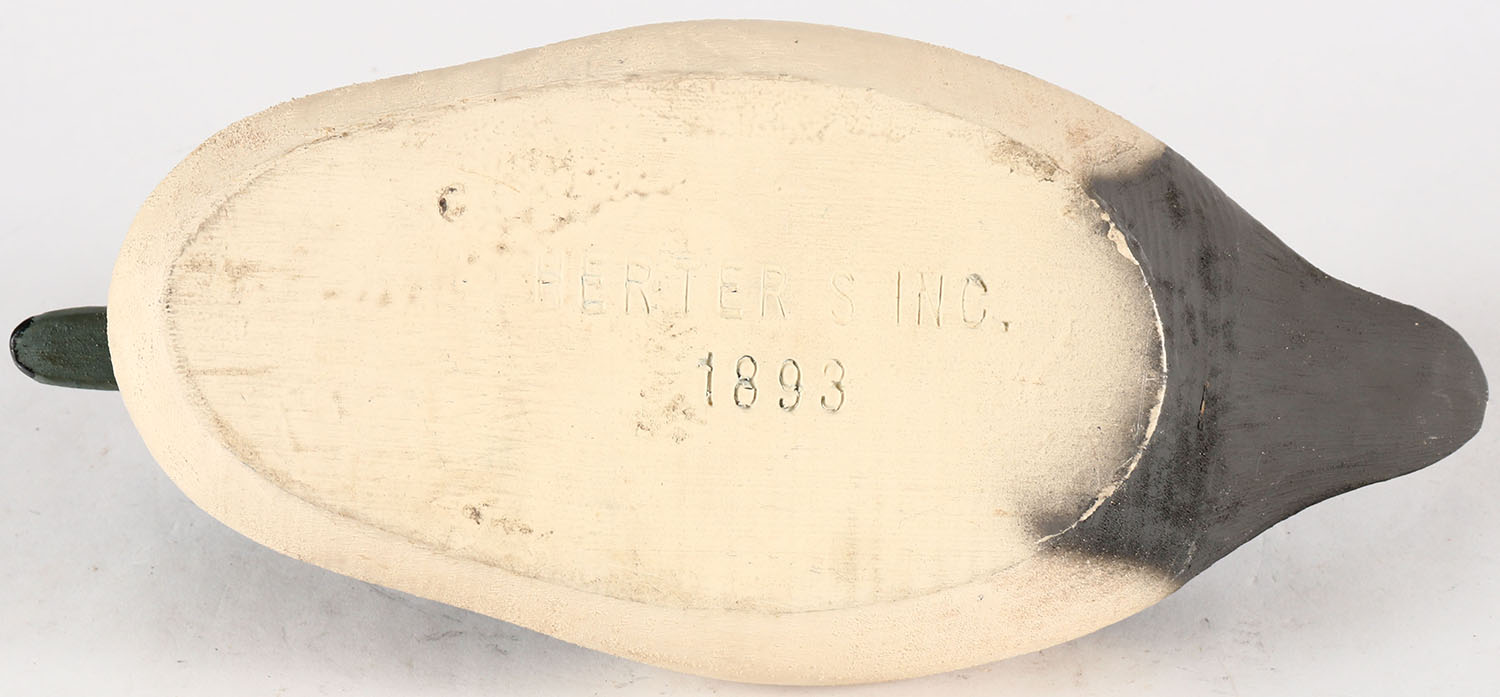 Bufflehead Drake by Herters Decoy Co., Waseca, MN, 1893 series, glass eyes, solid wood, original paint, structurally excellent, marked on bottom. Grade: Excellent ++ - Value: 50 to 100
