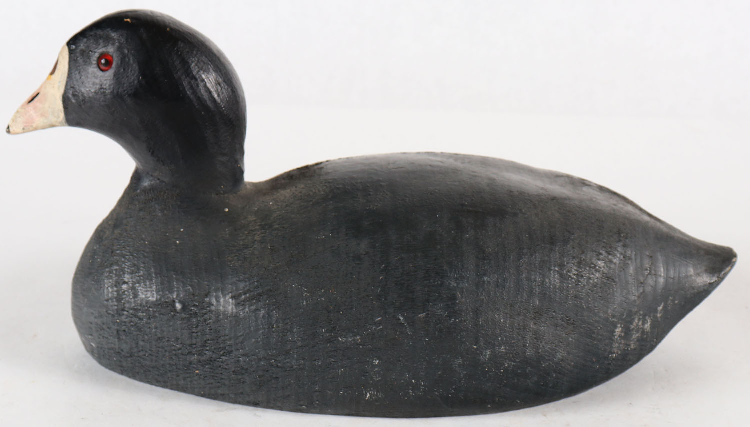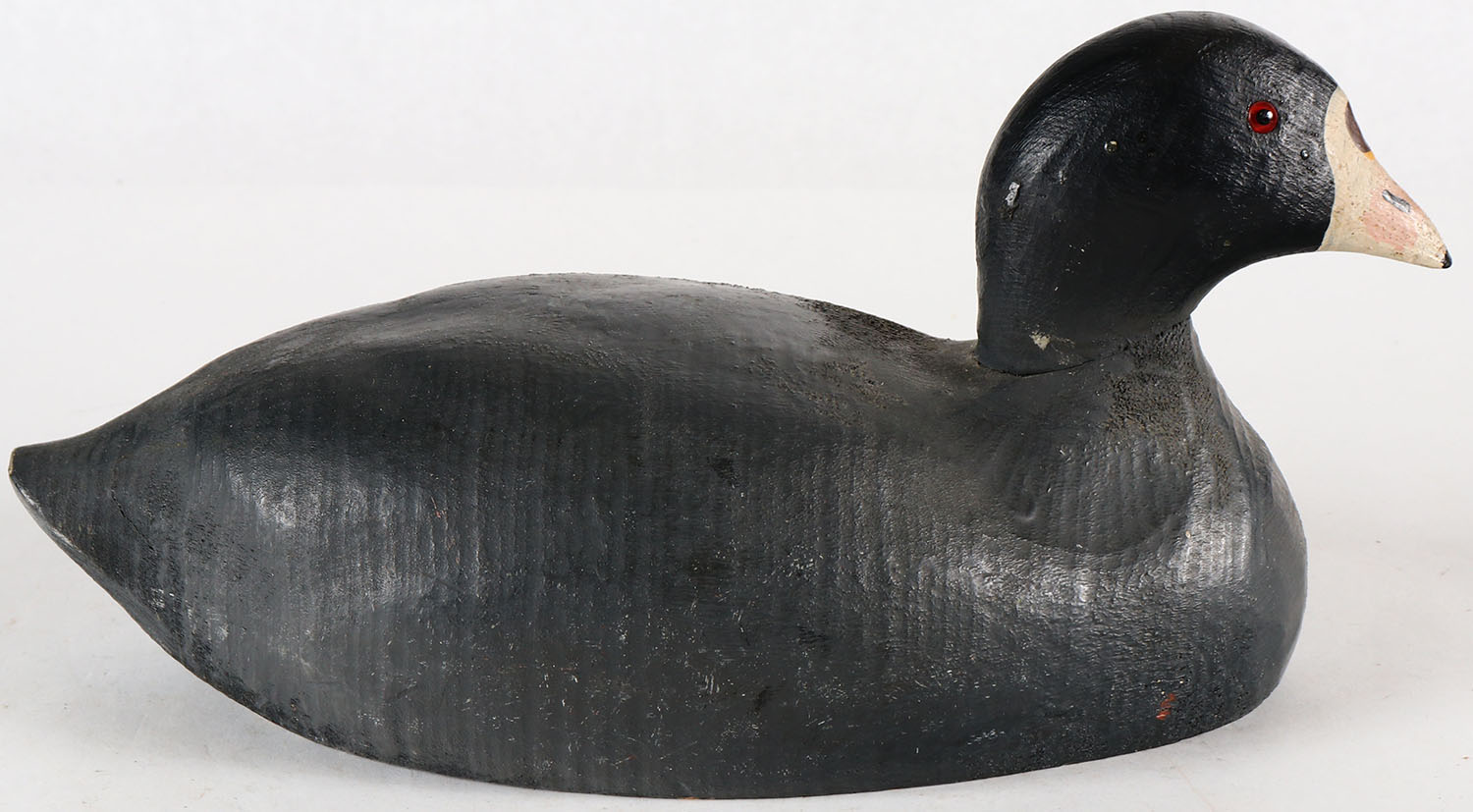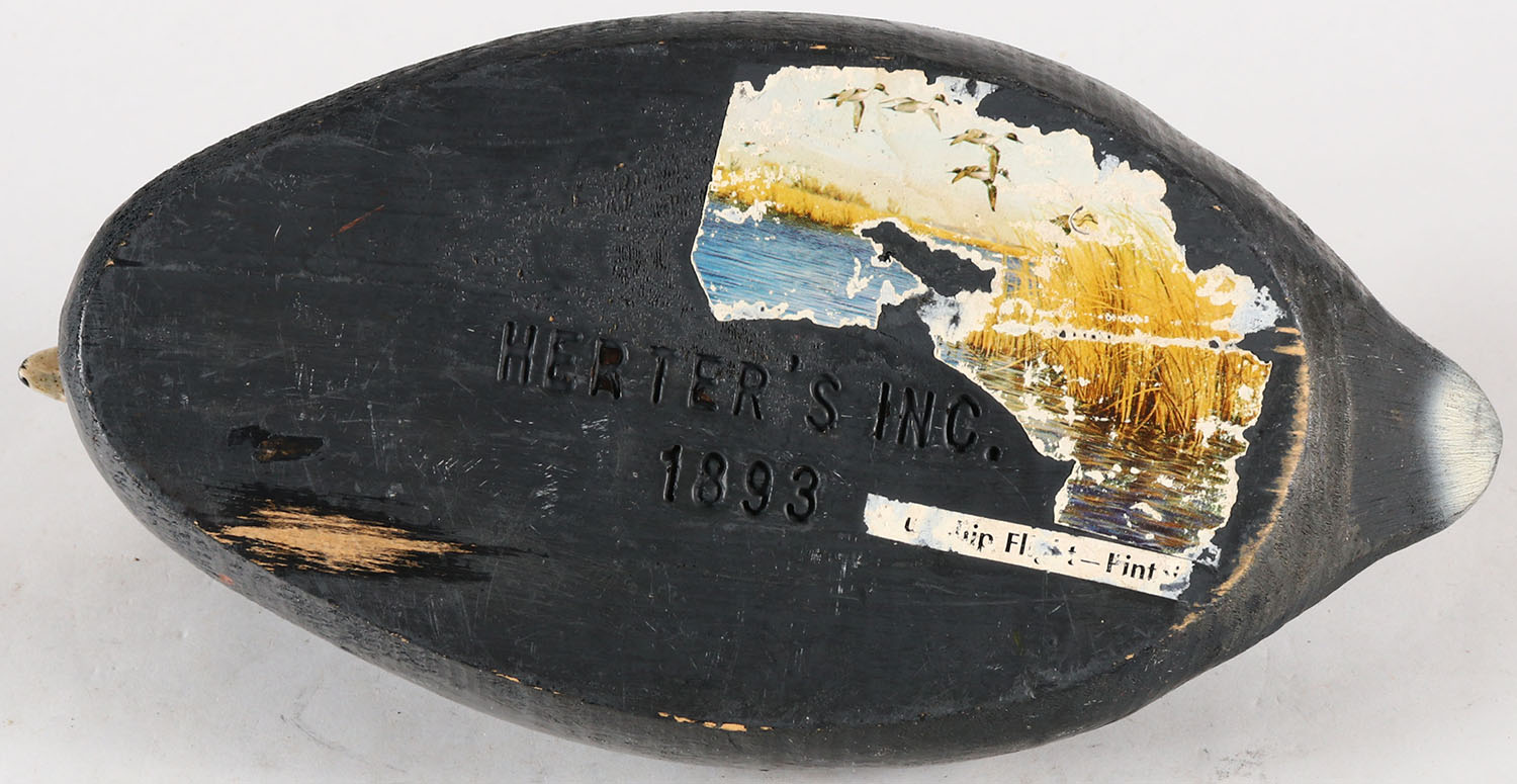 Coot by Herters Decoy Co., Waseca, MN, 1893 series, glass eyes, solid wood, original paint, structurally excellent, marked on bottom. Grade: Excellent ++ - Value: 50 to 100
