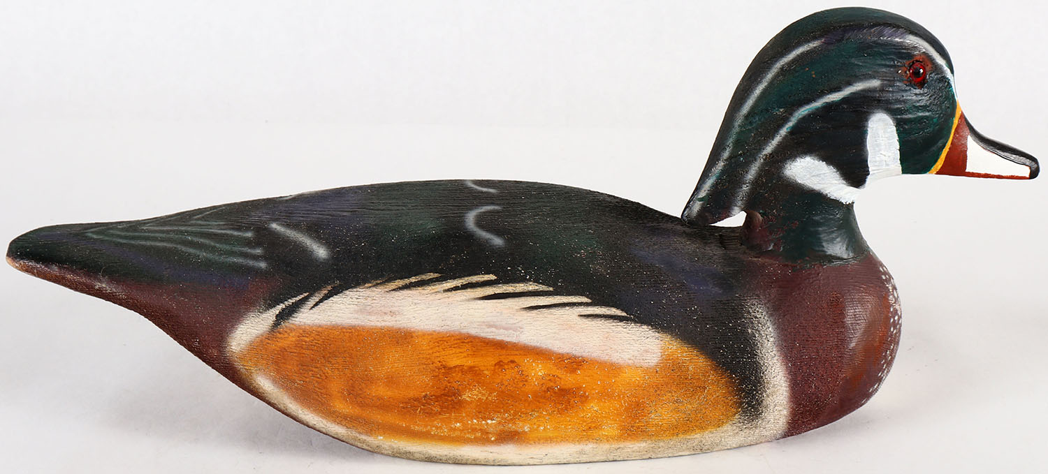 Woodduck Drake by Herters Decoy Co., Waseca, MN, 1893 series, glass eyes, solid wood, original paint, structurally excellent, unmarked on bottom. Grade: Excellent ++ - Value: 40 to 100