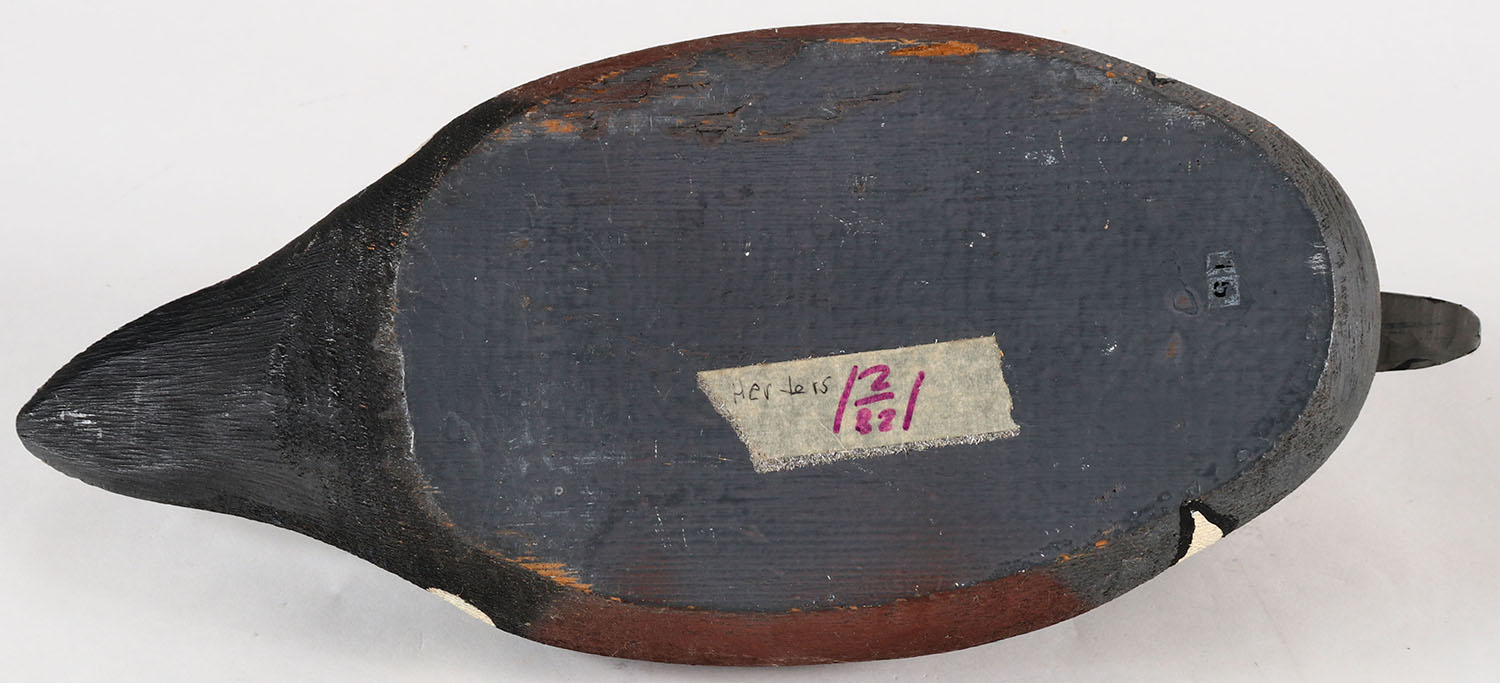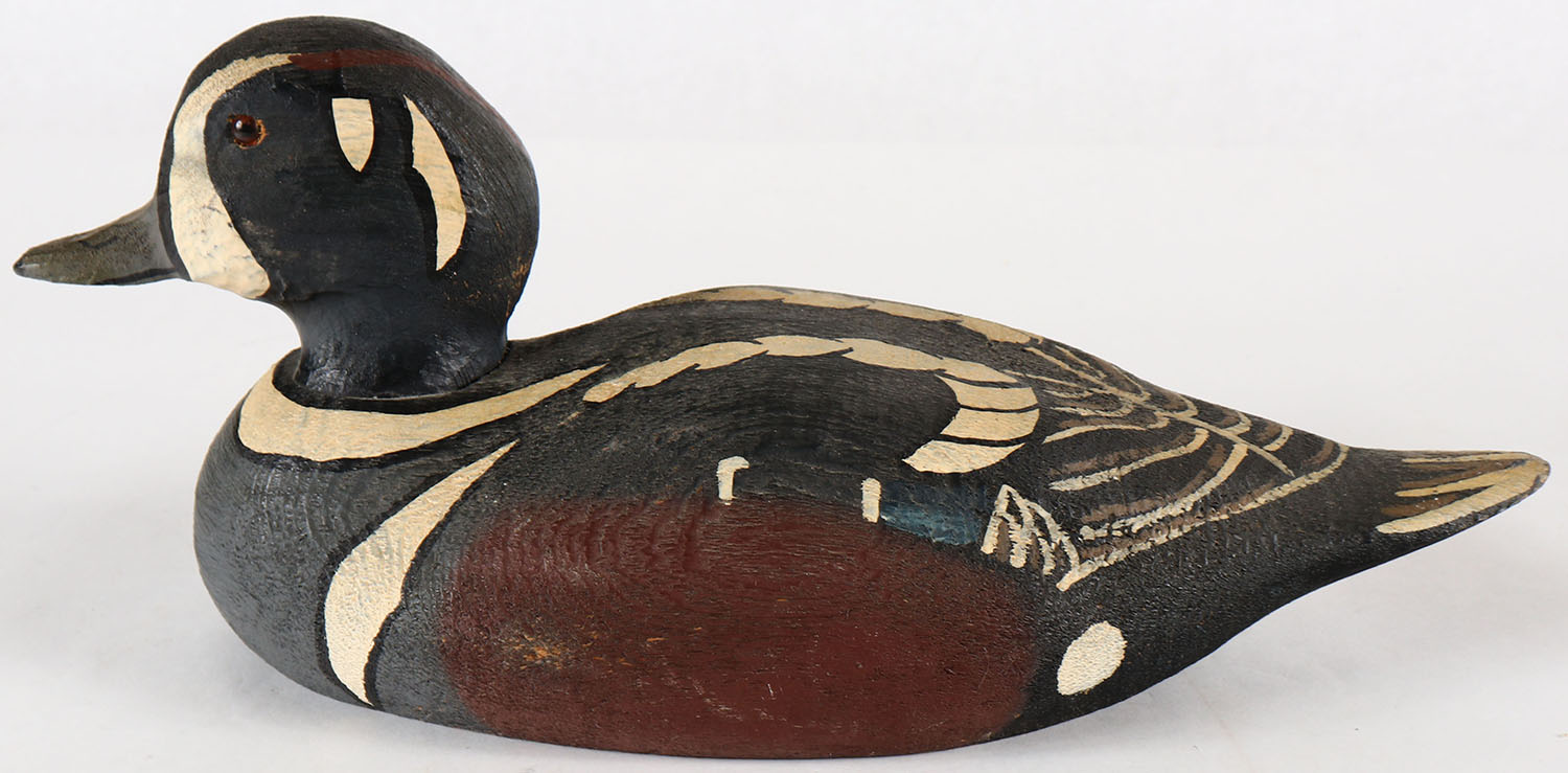 Harlequin Drake by Herters Decoy Co., Waseca, MN, 1893 series, glass eyes, solid wood, original paint, structurally excellent, unmarked on bottom. Grade: Excellent ++ - Value: 40 to 100