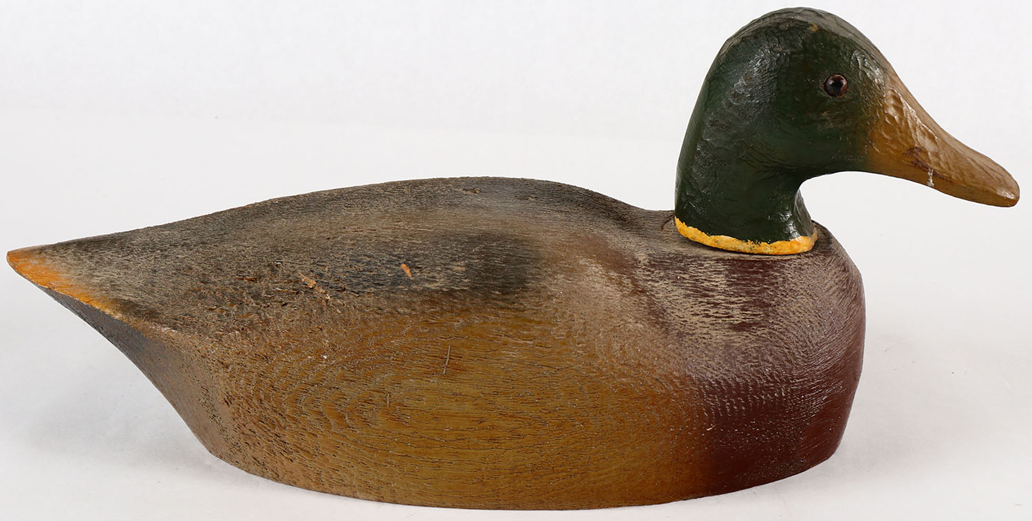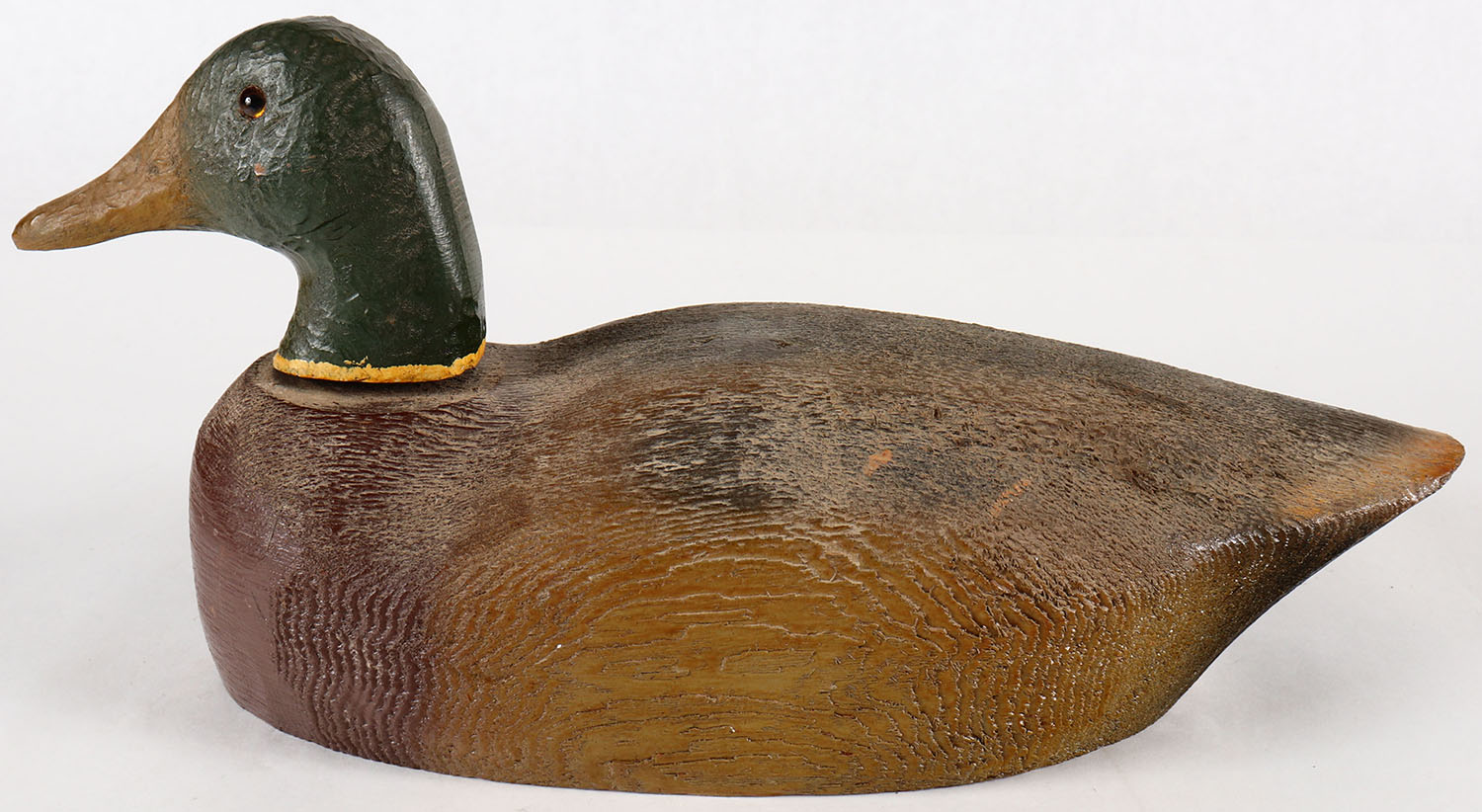 Mallard Drake by Herters Decoy Co., Waseca, MN, 1893 series, glass eyes, solid wood, original paint, structurally excellent, unmarked on bottom. Grade: Excellent - Value: 40 to 100
