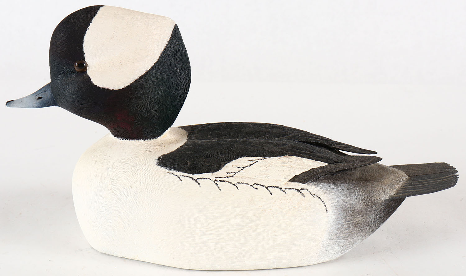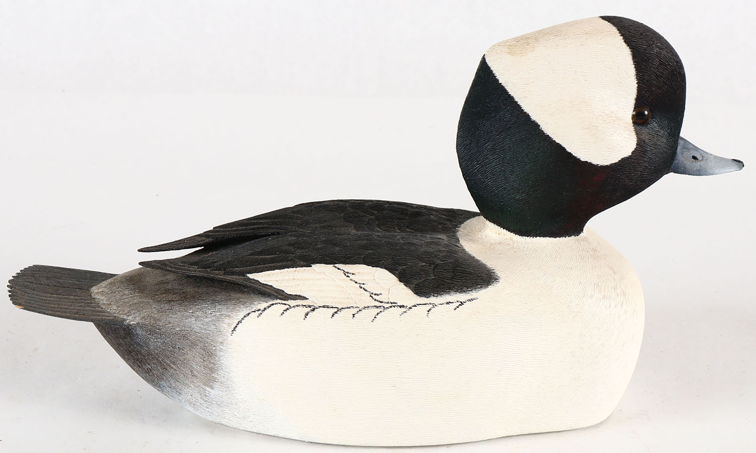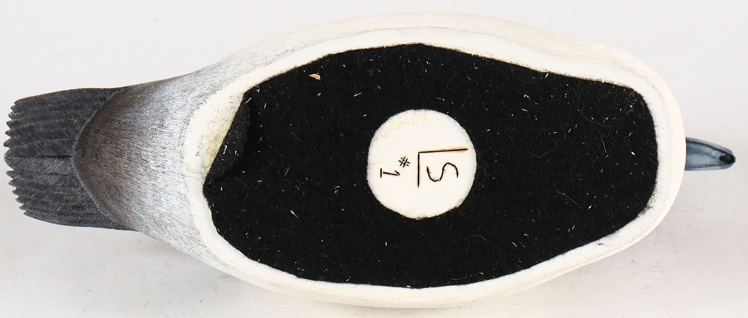 Bufflehead Drake by consignor which is branded on bottom, GE, solid Basswood, original paint with great feather detail, 10 1/2''. Grade: Excellent - Value: 40 to 200