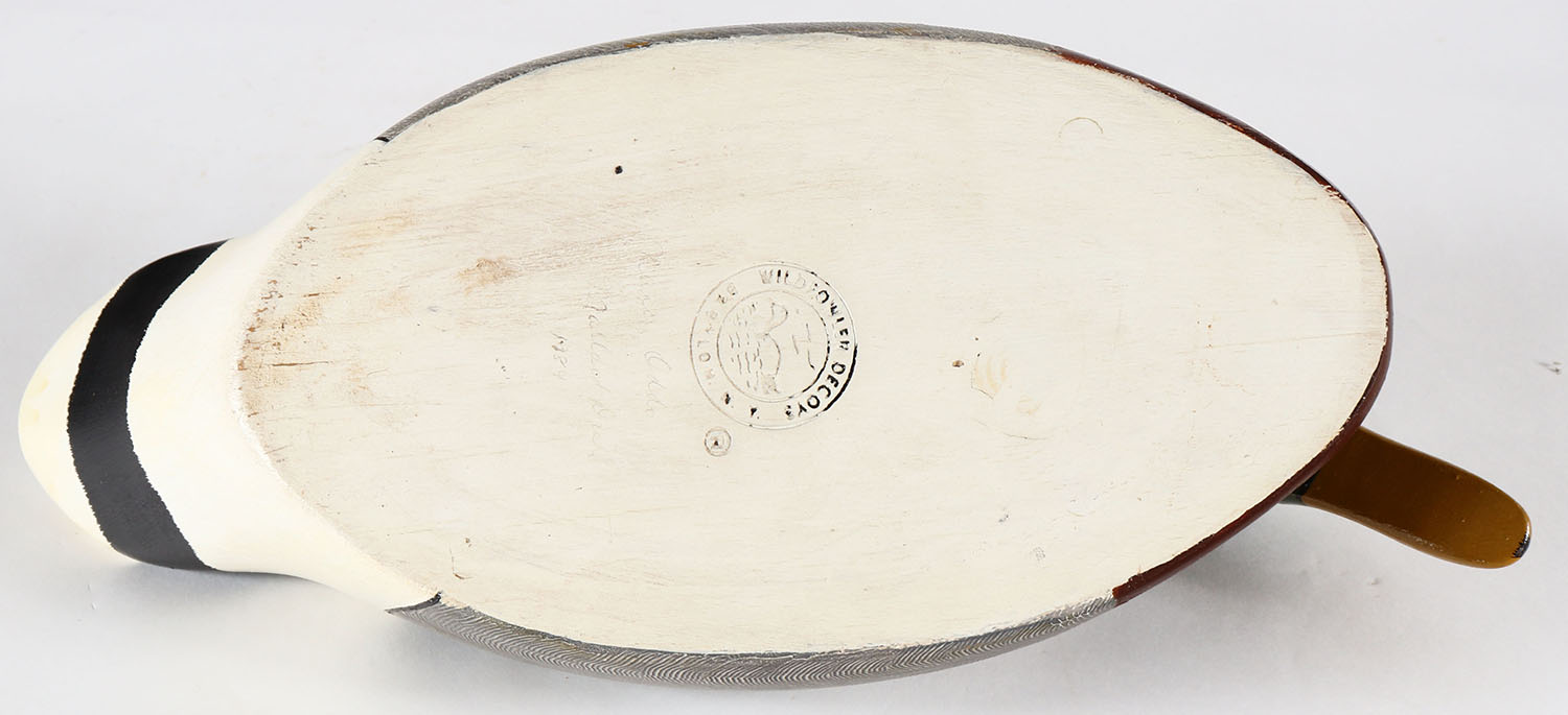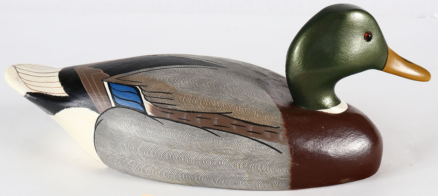 Mallard Drake by Wildfowler Decoy Co. Babylon NY, GE solid wood, orignal paint, stamped on bottom. Grade: Excellent ++ - Value: 20 to 40