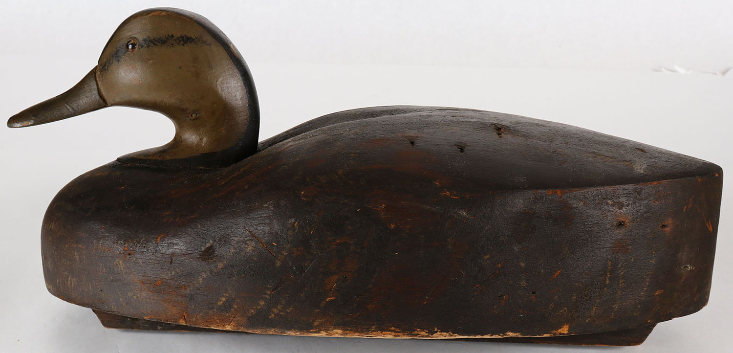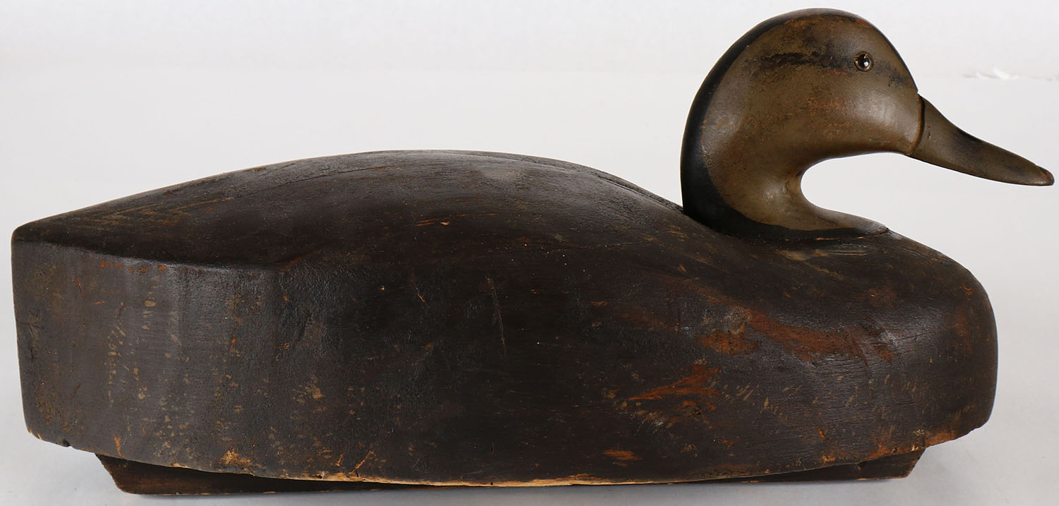 Black Duck by Wildfowler Decoy Co., Old Saybrook, CT, GE, Solid wood, no stamp on bottom, original paint. Grade: Excellent - Value: 40 to 80