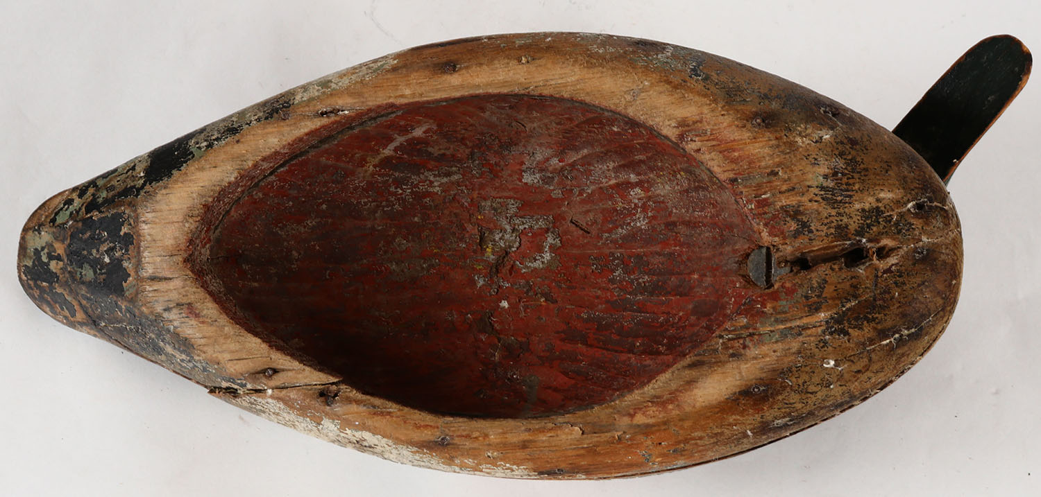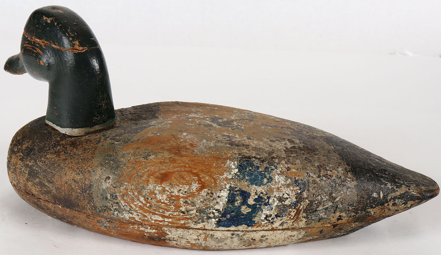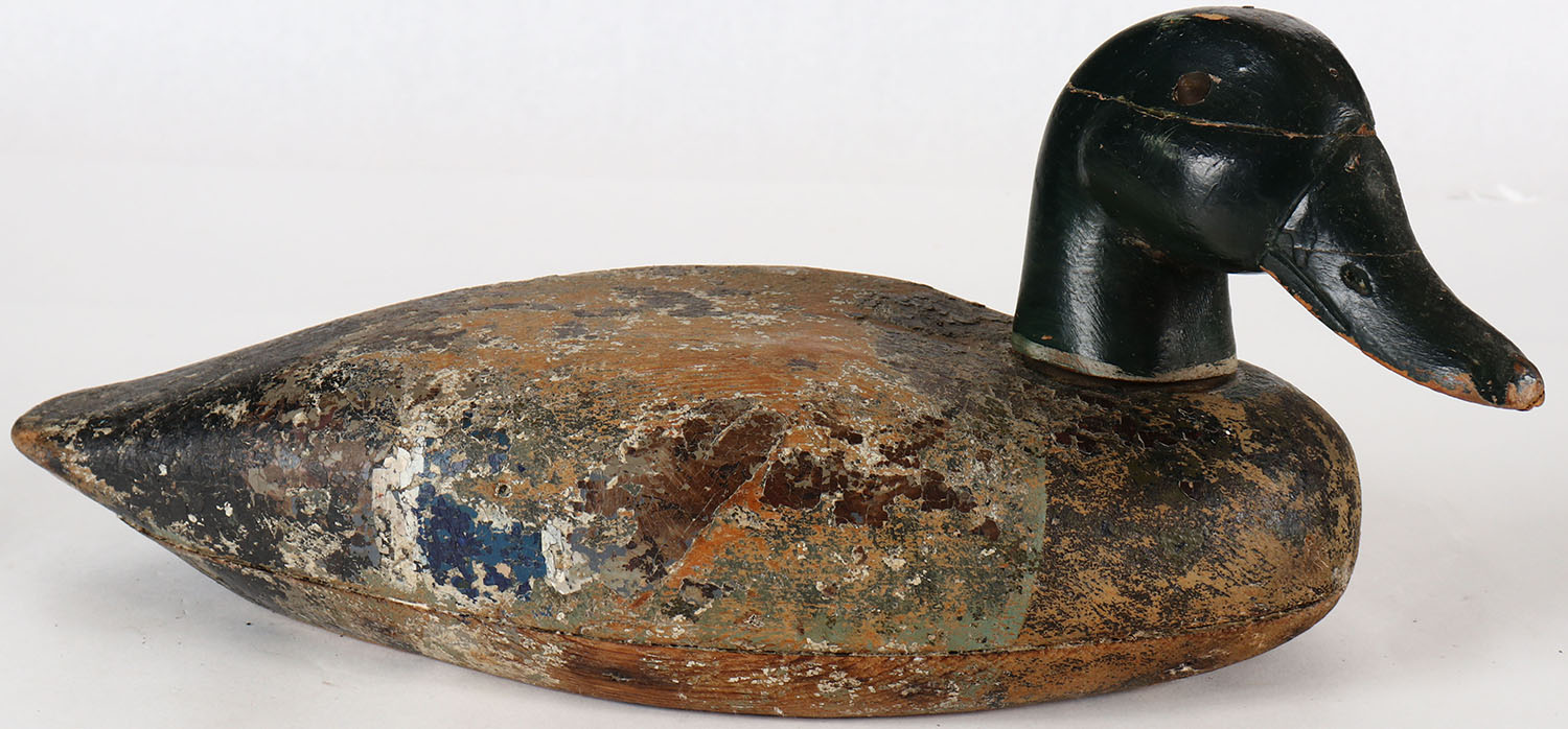 Mallard Drake by unknown carver, TE, bottom is hollowed out, orignal paint show wear, head has a crack. Grade: Very Good - Value: 10 to 30