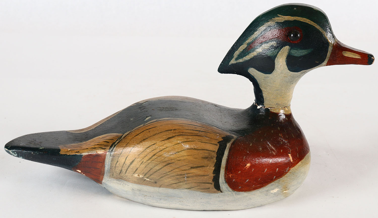 Woodduck Drake by unknown carver, GE, solid wood, original paint, has neck crack. Grade: Very Good + - Value: 20 to 40