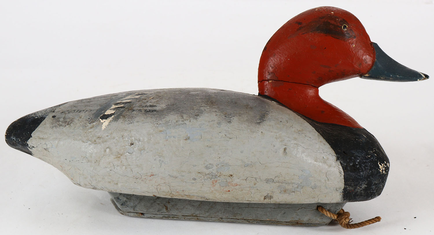 Canvasback Drake by unknown maker, PE, solid wood, original paint, has hair line crack in neck. Grade: Very Good ++ - Value: 10 to 30