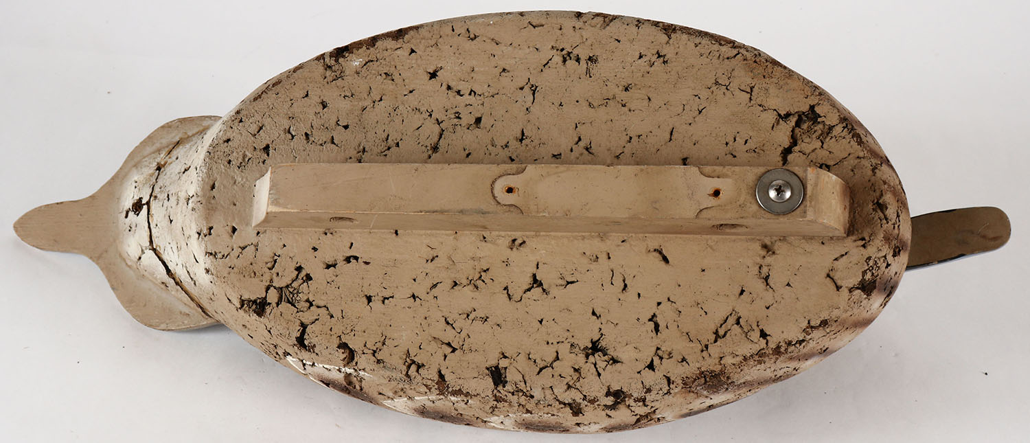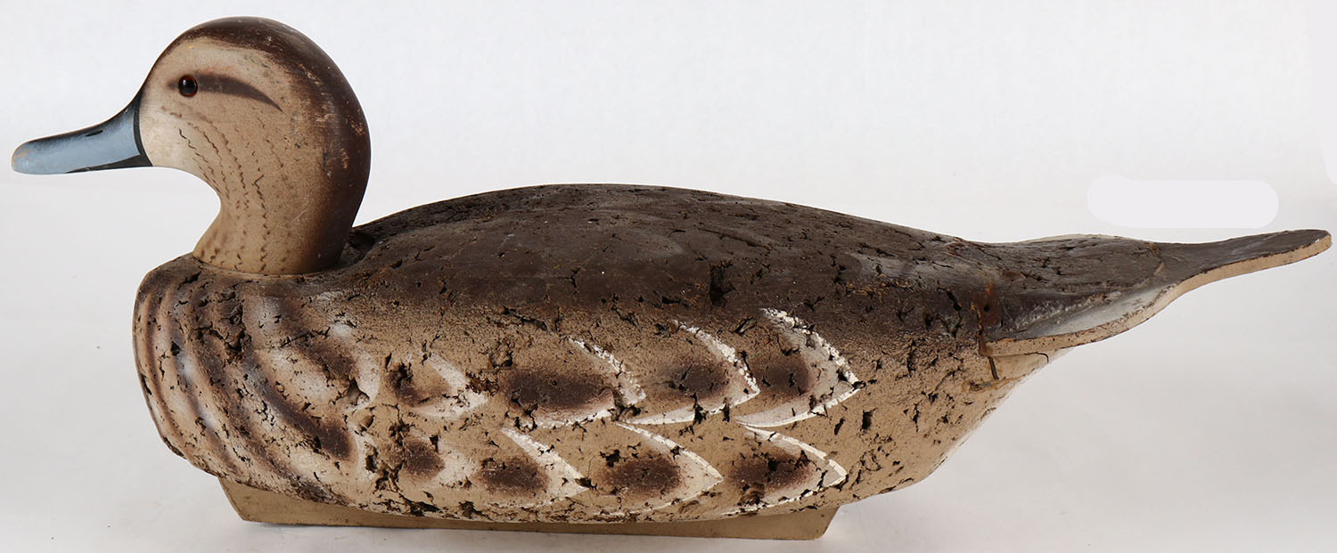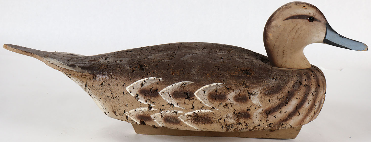 Pintail Hen by S.W. Early Waterfowl Supply Co., marked on keel, glass eyes, solid cork body, wood head, original paint, near mint other than the under side of butt has a repair, This company operated in the SW of the USA in the 1990's. Grade: Very Good ++ - Value: 10 to 40