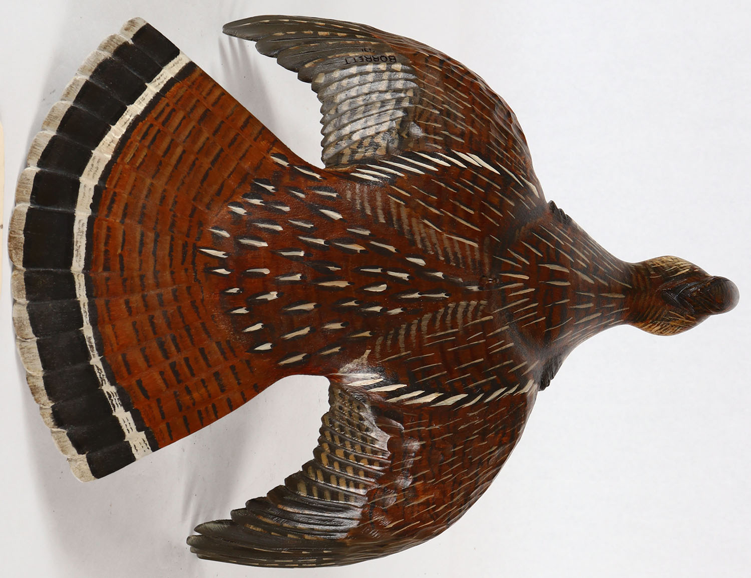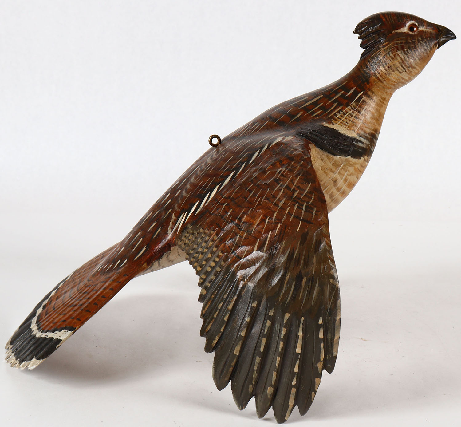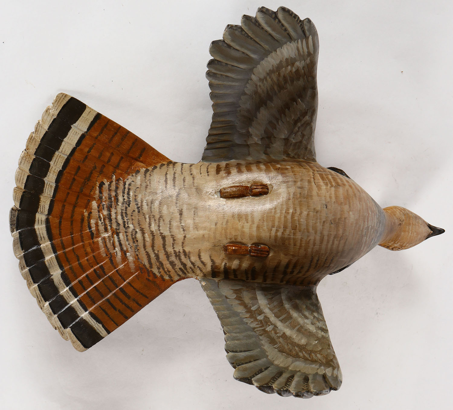 Ruffed Grouse by Mike Borrett Madison, WI, wings cupped, glass eyes, wood carved from 2001, original paint, structurally excellent. Grade: Excellent ++ - Value: 100 to 400