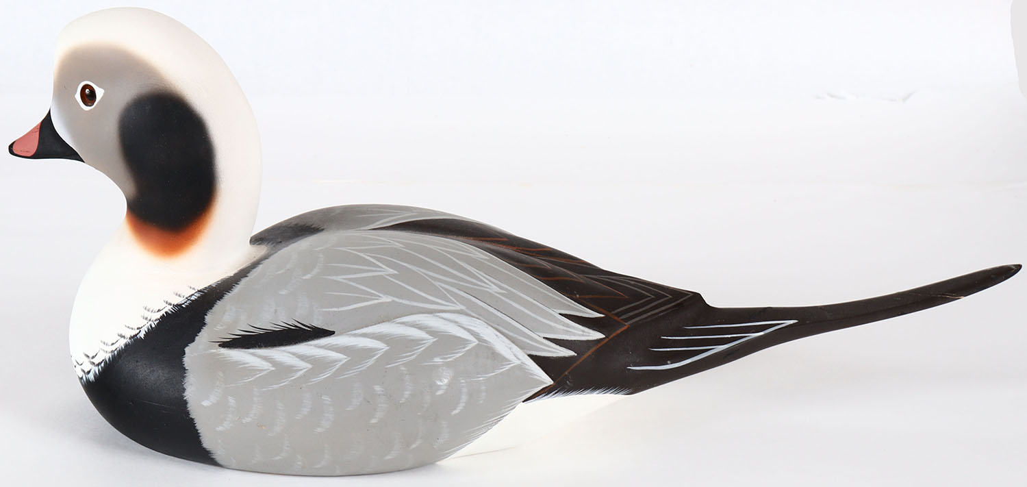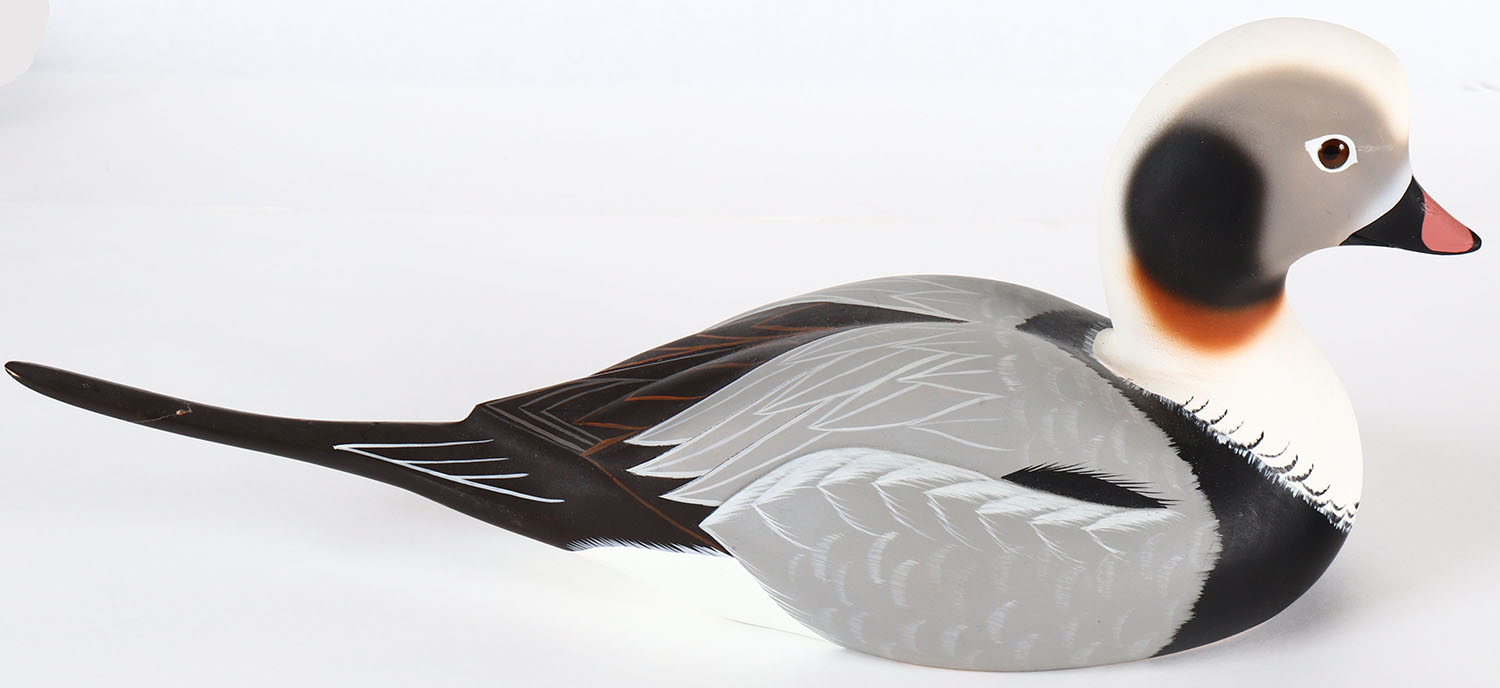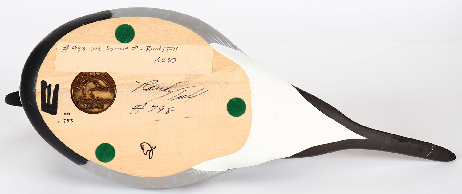 Old Squaw Drake by Randy Tull, for DU 1989-90, has coin on bottom, GE, soldi wood, mint original paint, tail has been repaired otherwise mint. Grade: Very Good ++ - Value: 30 to 60