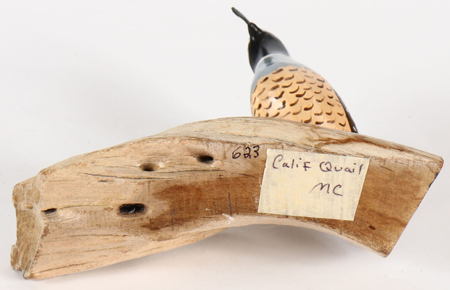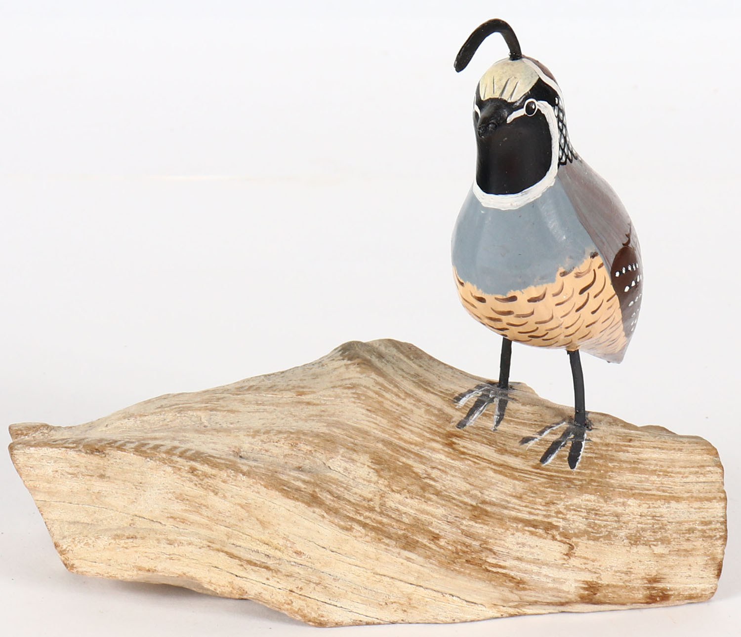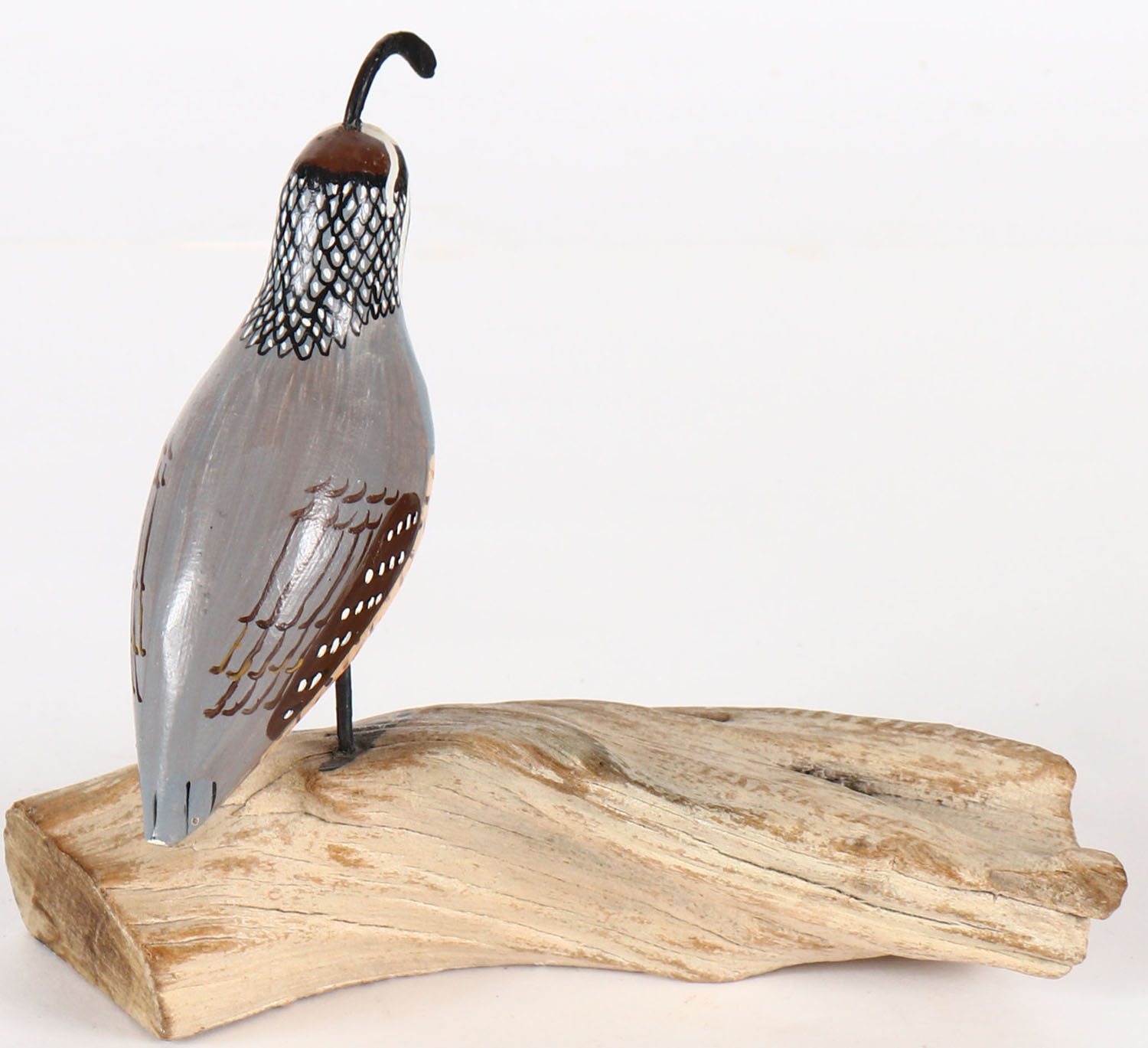 Miniature California Quail by unknown maker, solid wood, GE, original paint, on drift wood, 5 1/4 tall. Grade: MINT - Value: 10 to 30