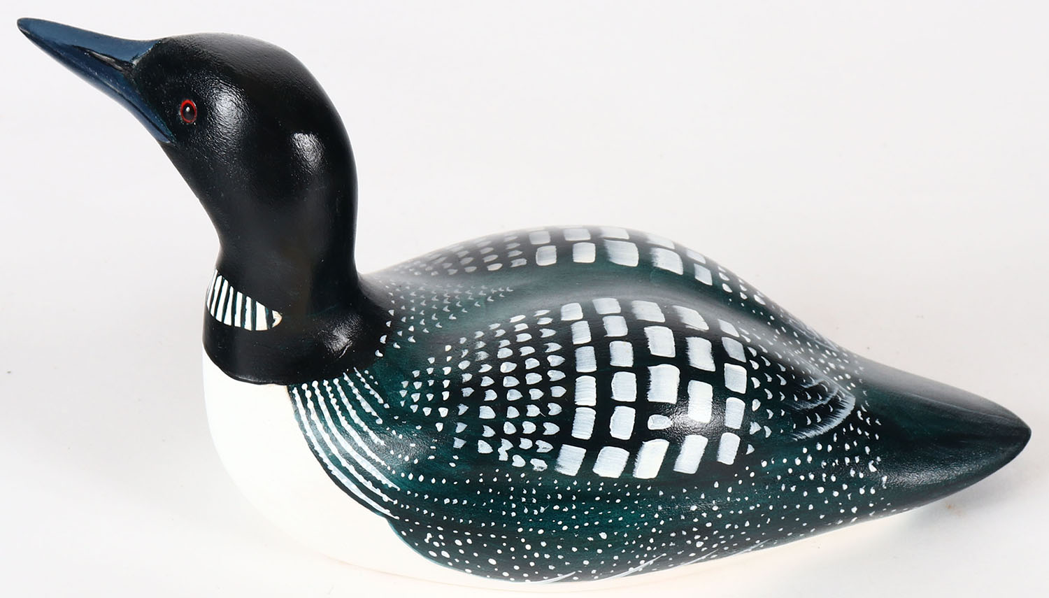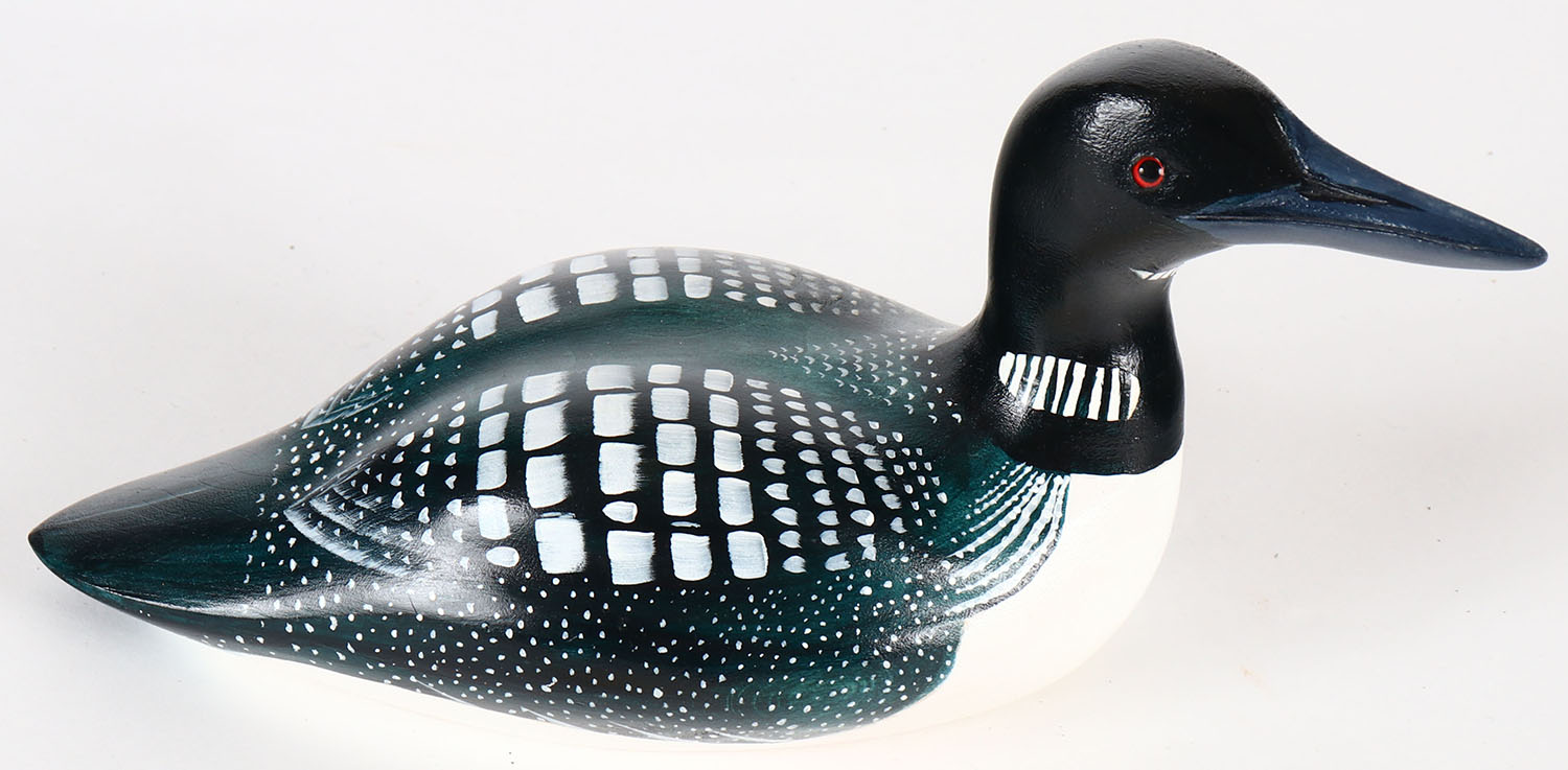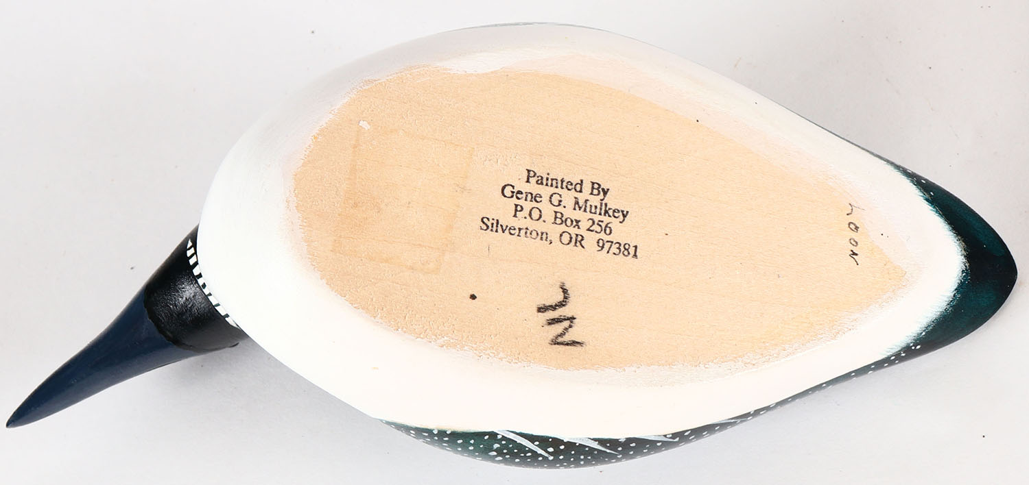 Miniature Loon by Gene G. Mulkey, Silverton, OR, GE, solid wood, mint original paint, signed on bottom, 8'' OAL. Grade: MINT - Value: 10 to 30