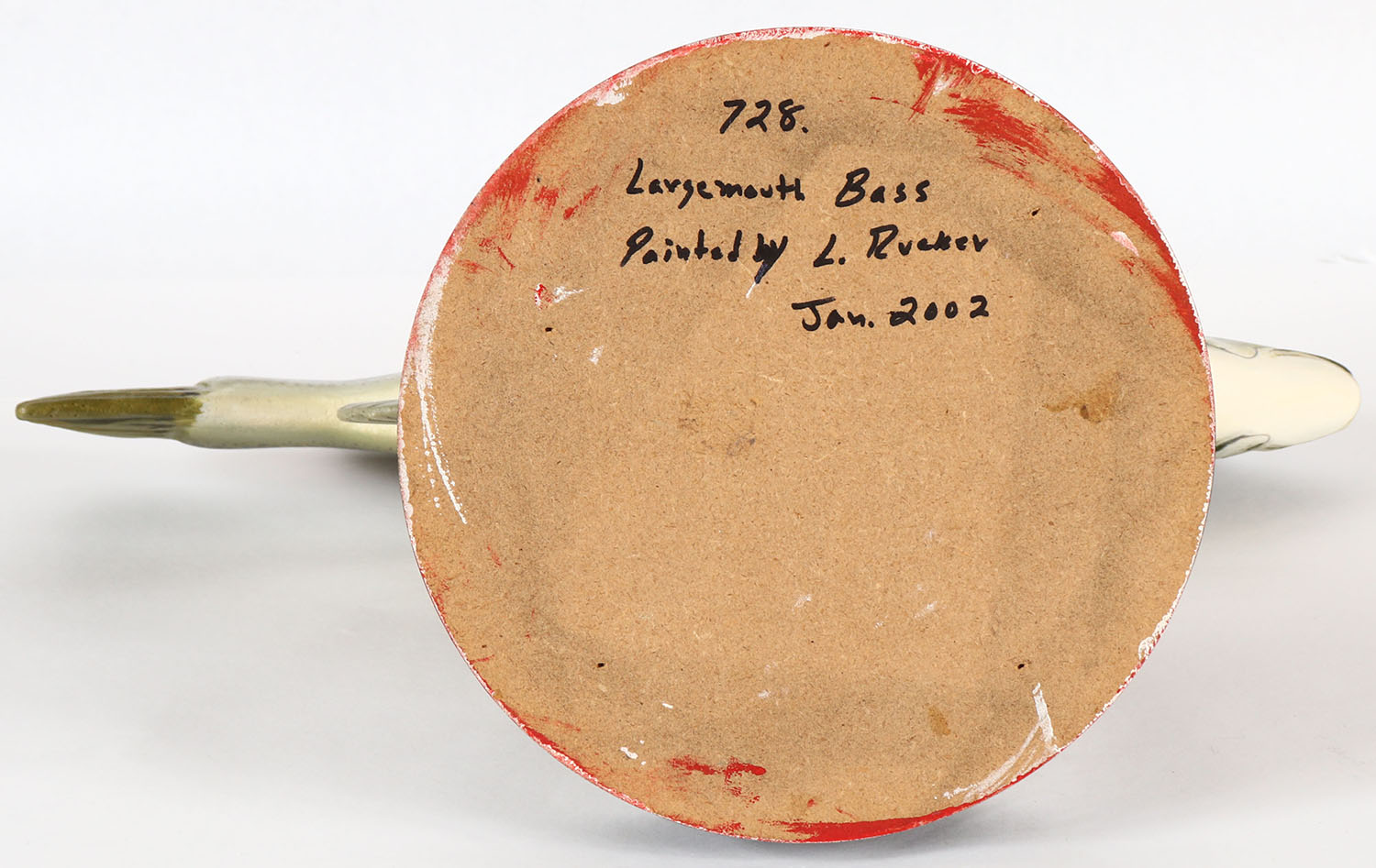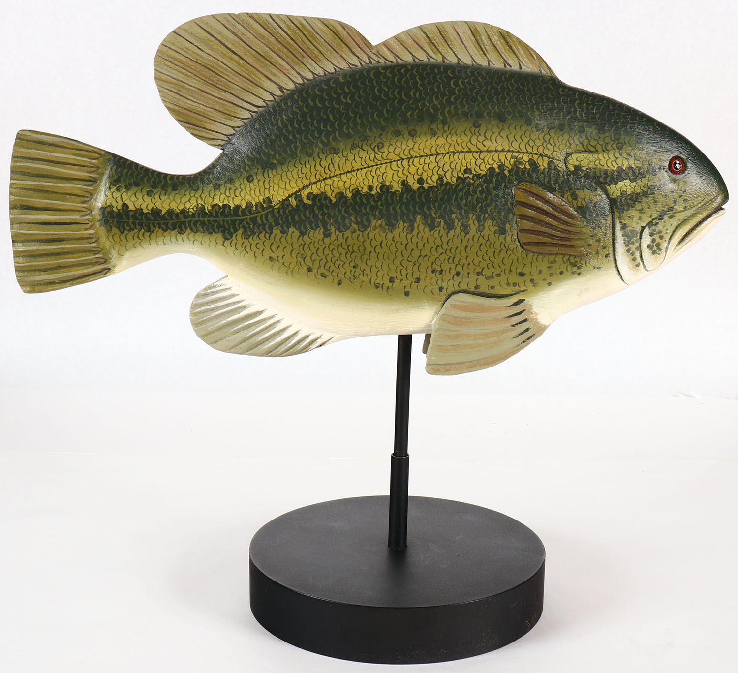Large Mouth Bass by Larry Rucker, Renton WA, PE solid wood hand carved & wonderfully hand painted, on stand, signed on bottom, 18'' OAL, Grade: Excellent ++ - Value: 50 to 100