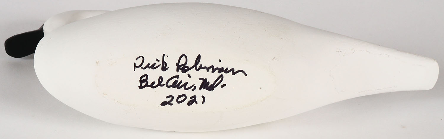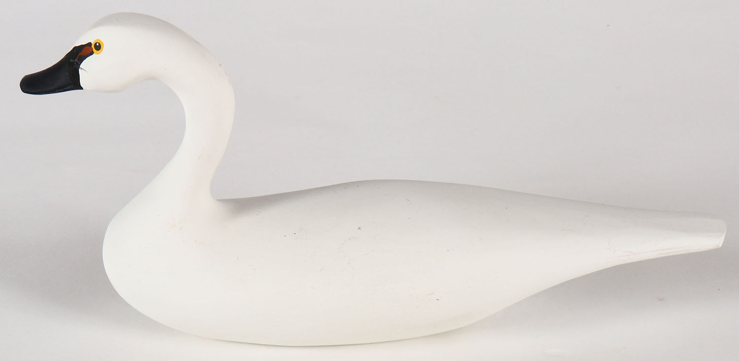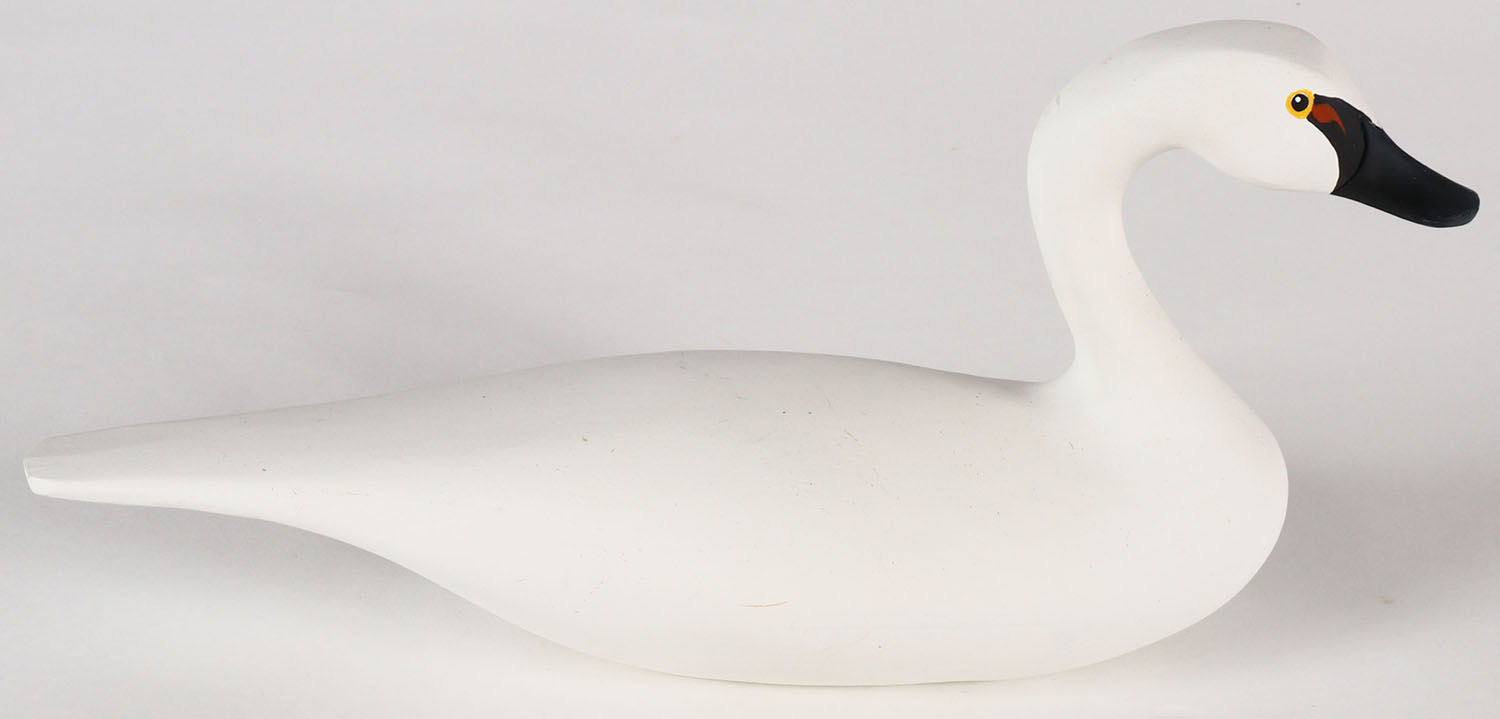 Miniature Swan by Dick Robinson of Bel Air, MD, PE, solid wood, mint original paint, signed on bottom, 8 1/2'' OAL. Grade: MINT - Value: 20 to 60