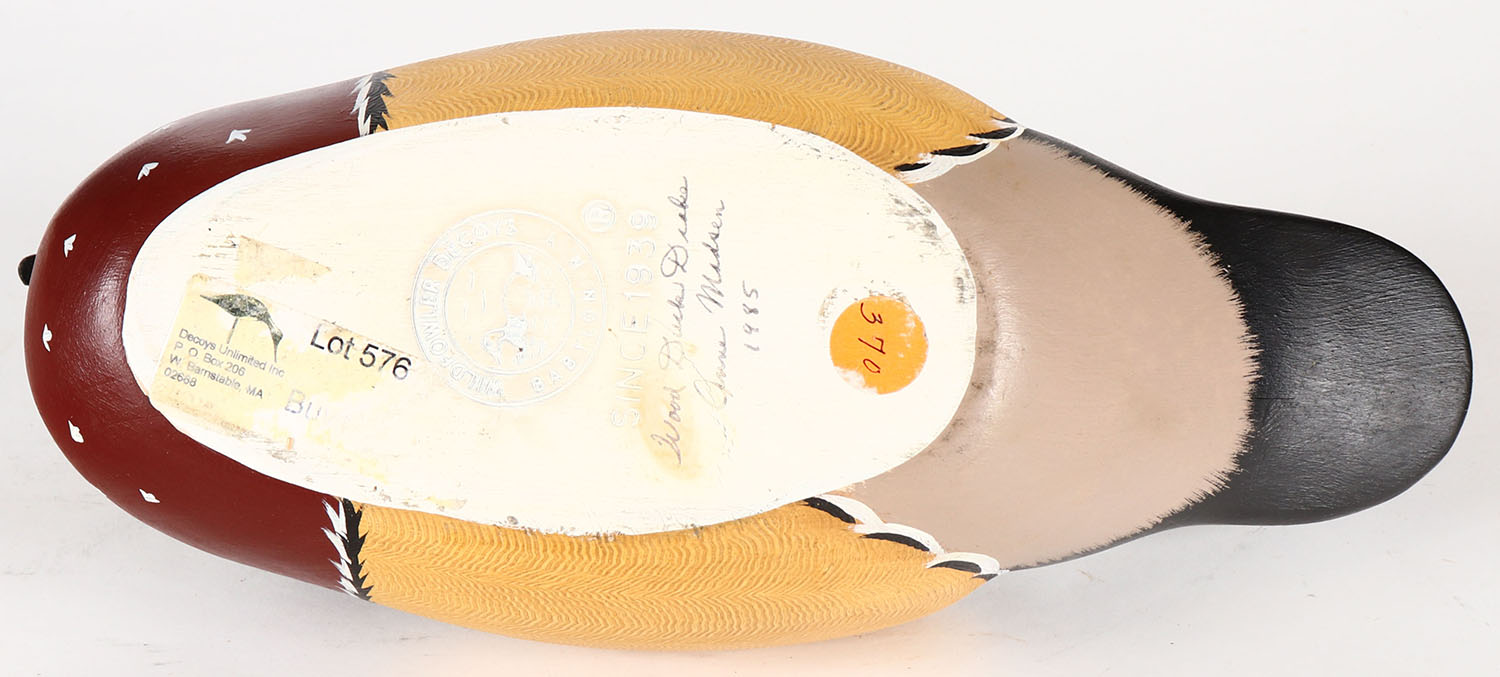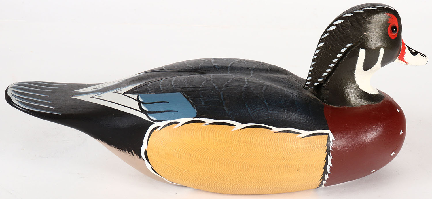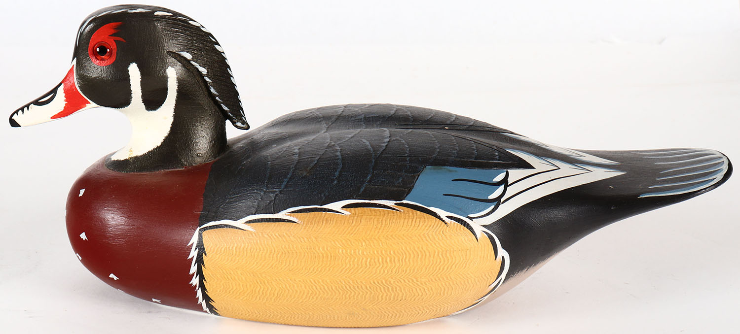 Woodduck Drake by Wildfowler Decoy Babylon NY, GE, solid wood, near mint original paint, well stamped on bottom. Grade: Excellent ++ - Value: 20 to 60