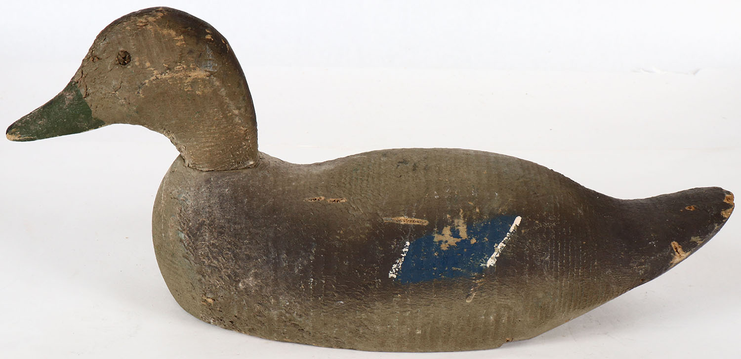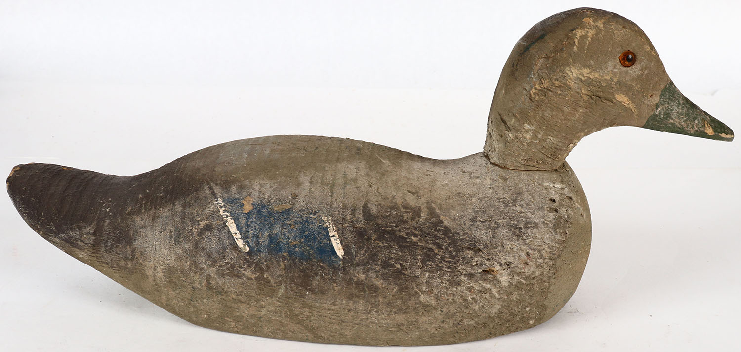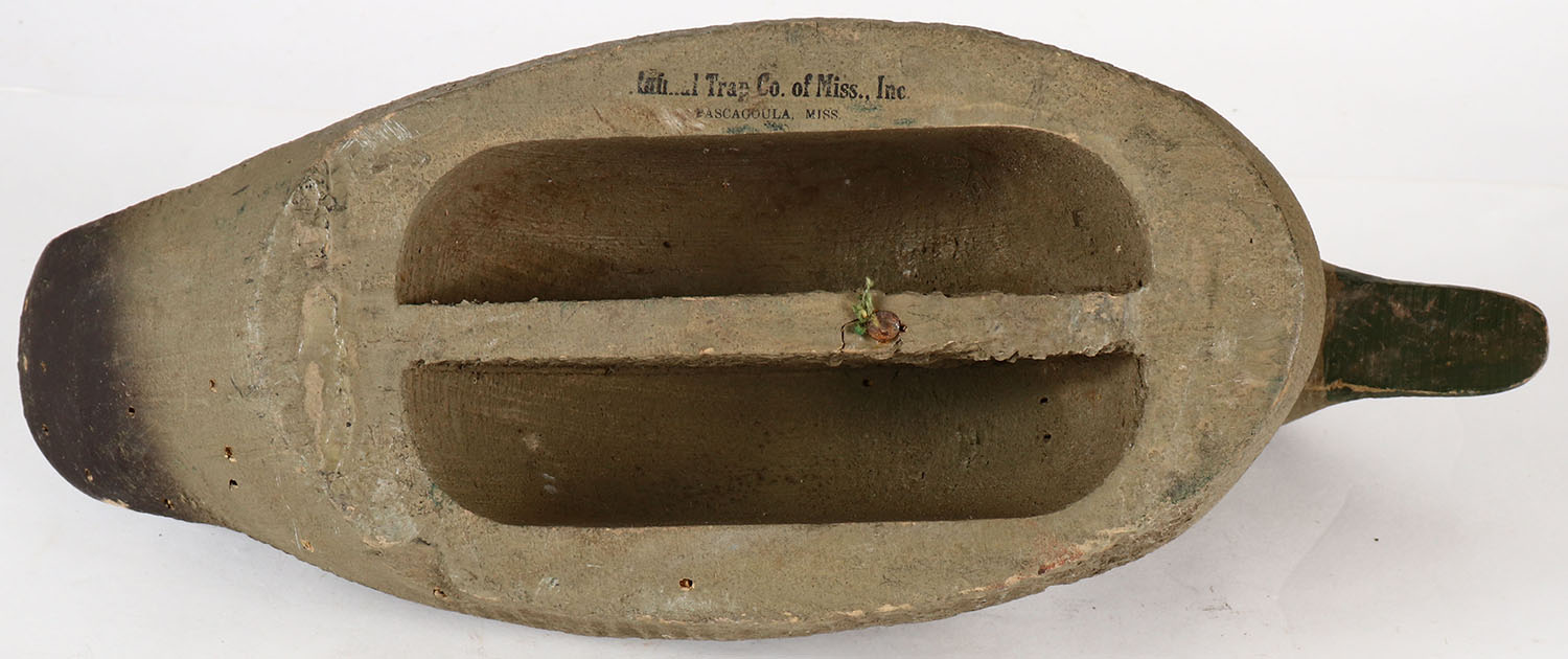 Mallard Hen by a Animal Trap Co. Miss Inc., glass eyes, solid wood, original paint, structurally excellent, stamped on bottom. Grade: Excellent - Value: 10 to 30