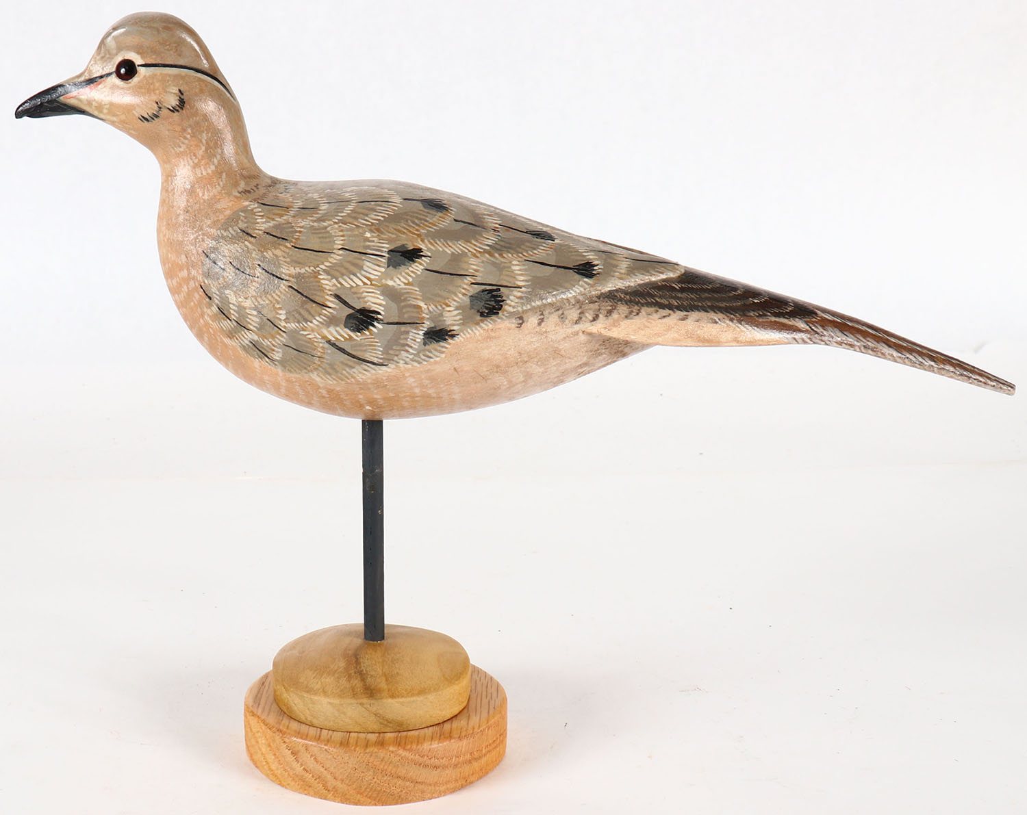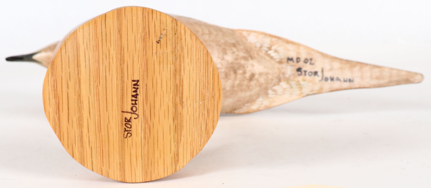 Morning Dove by Stor Johann, signed on decoy & stand on bottom, GE, solid wood, mint original paint, 11 1/2'' OAL. Grade: MINT - Value: 20 to 60