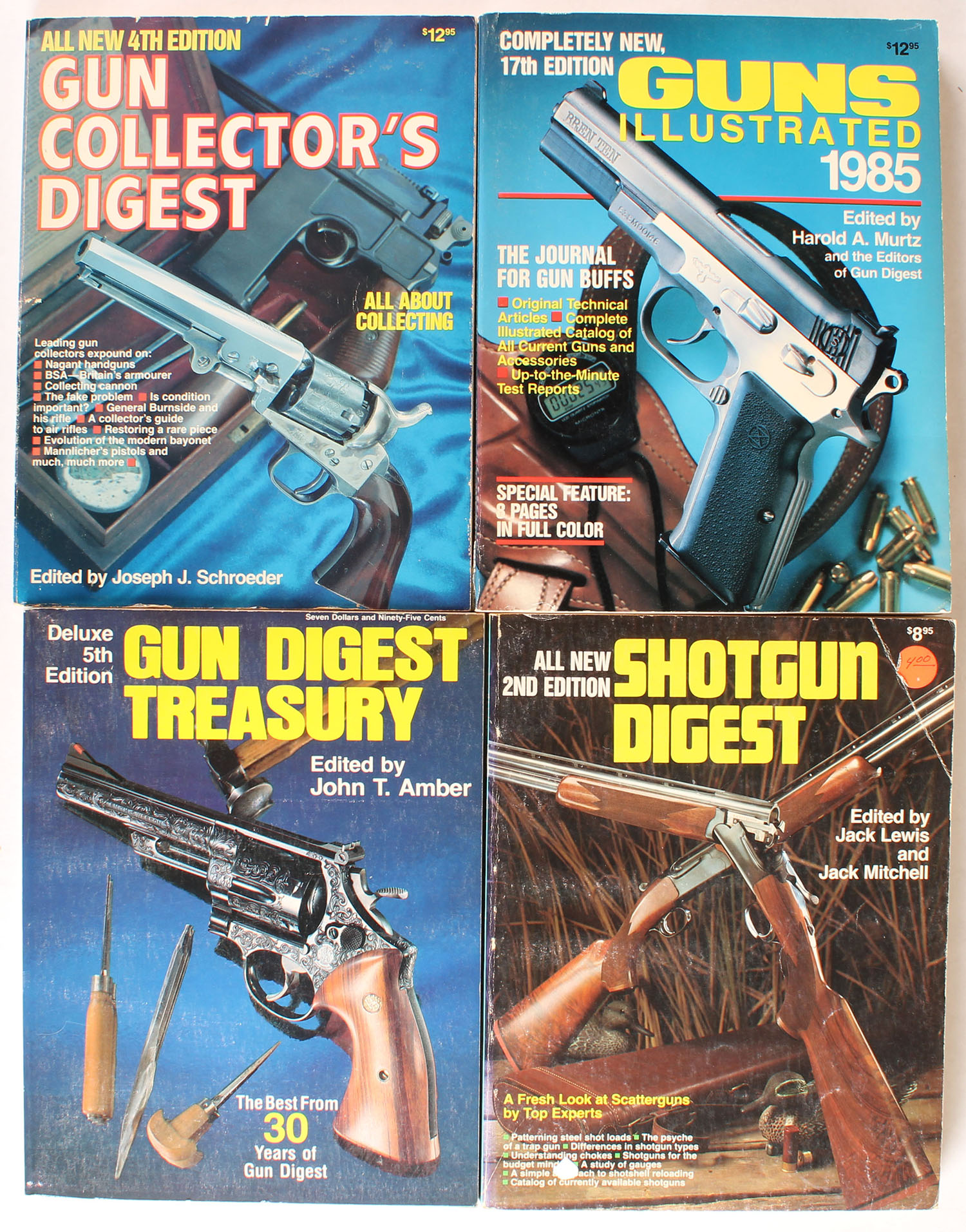 Lot of 4 vintage gun catalogs, Gun Collector's Digest 4th Edition, Guns Illustrated 1985, Shotgun Digest 2nd Edition, Gun Digest Treasury 5th Edition, 8 1/2'' x 11'', B/W & color photos, All in very good condition, with slight signs of wear on paper covers. Grade: Very Good - Value: 5 to 50