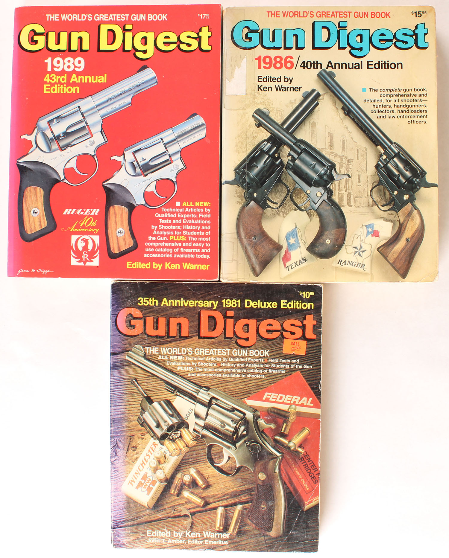 Lot of 3 Vintage Gun Digest Catalogs, 1981, 1986, & 1989 editions. 448 - 481 pages, 8 1/2'' x 11'', B/W & color photos, All in very good condition, with light use on paper covers. Grade: Very Good - Value: 5 to 50