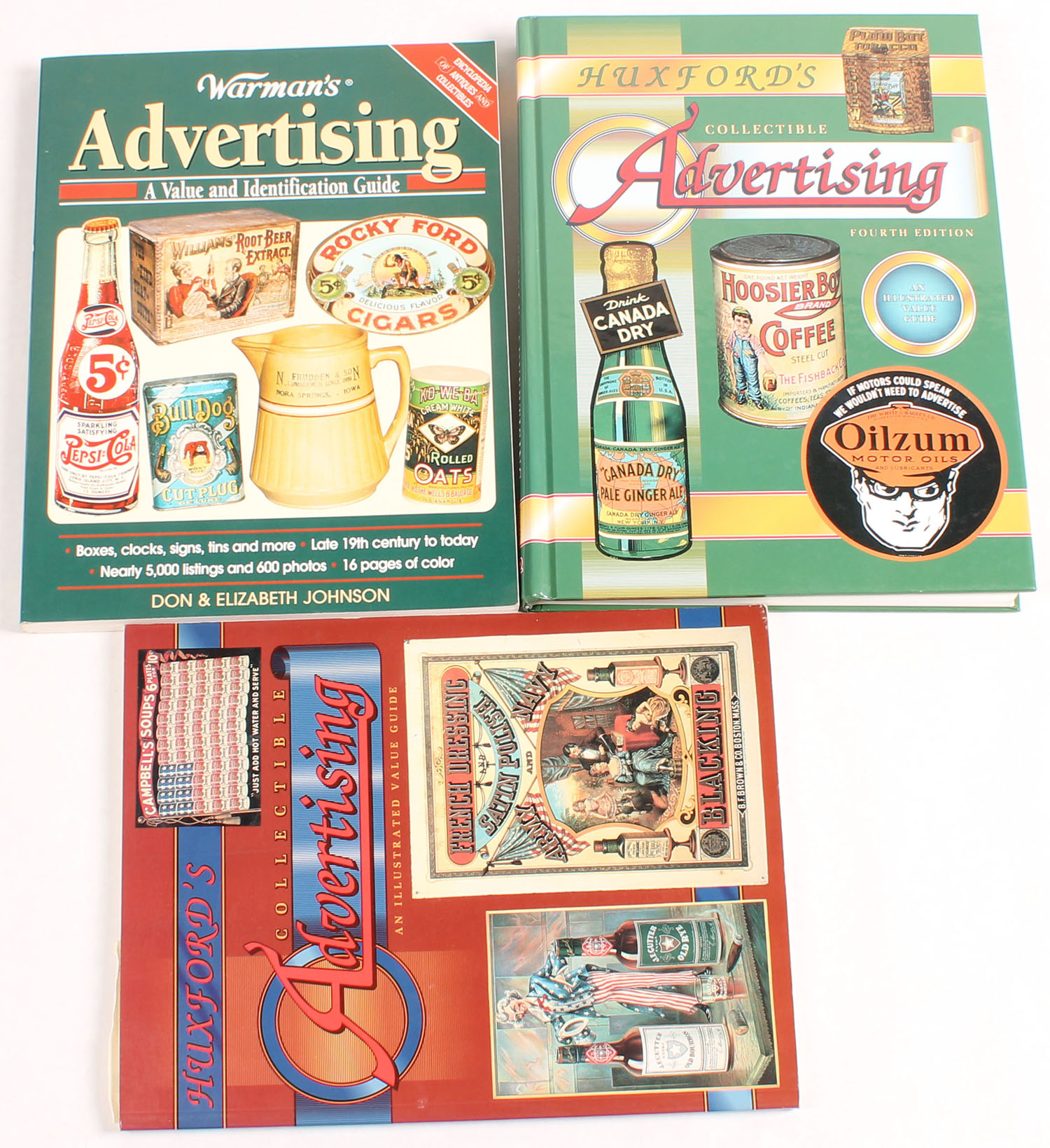 Lot of 3 Collectible Advertising Value and Identification Guides. Two are Huxford's one is Warman's, color and b/w photos, 9 1/2'' x 11 1/2'' Grade: Very Good - Value: 5 to 30