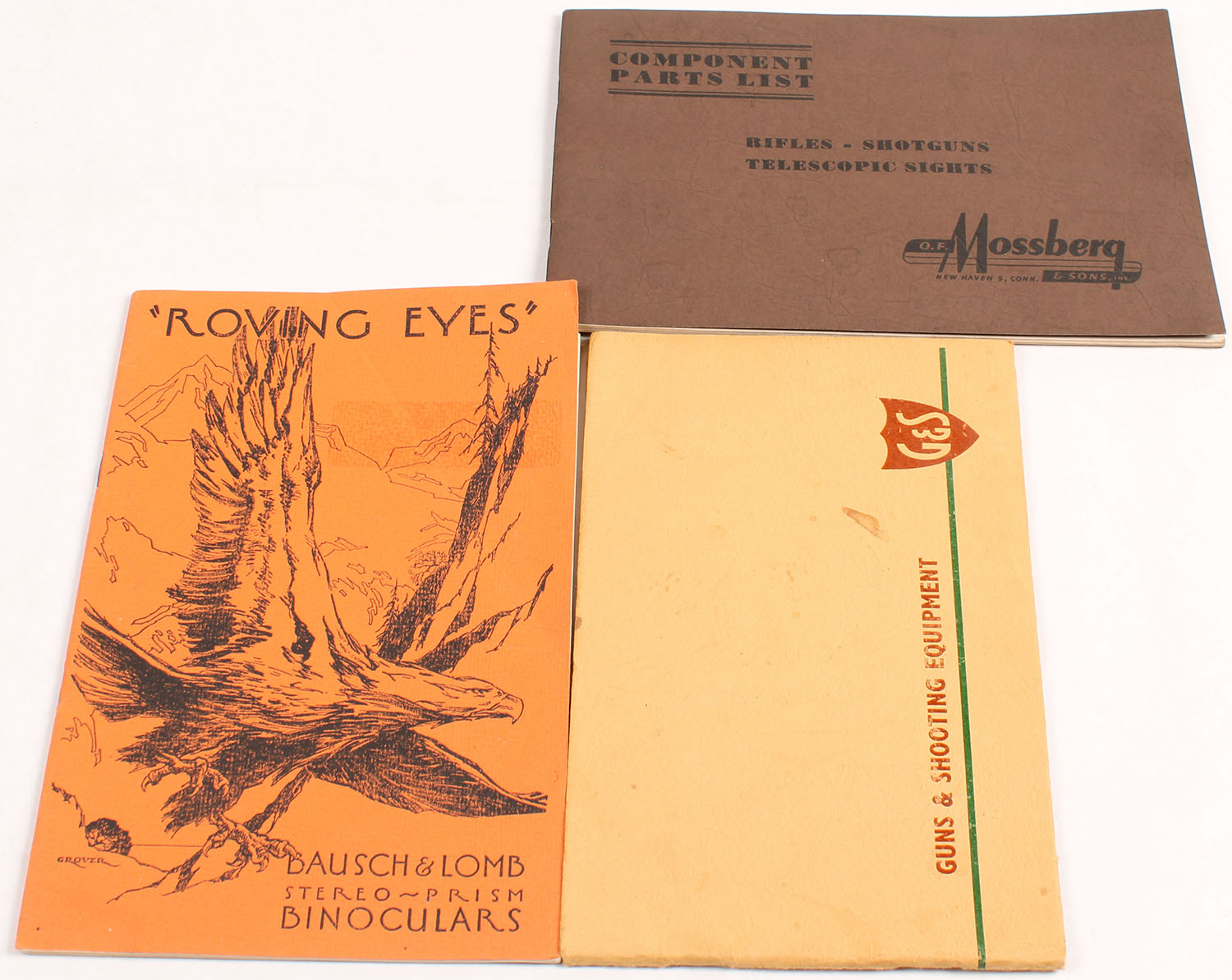 Lot of 3 manufacture catalogs. (1) Mossberg Rifles Shotguns and Telescopic sights 6'' x 9'', 67 pages, pages clean, paper cover very good, binding tight. (2) Roving Eyes Bausch & Lomb Binoculars 1930. 6'' x 9 1/2'' 31 pages, pages clean, paper cover good, binding tight. (3) Gallyon & Sons Guns & Shooting Equipment. 5 1/2'' x 8 1/2'', 44 pages, pages clean, binding tight, paper cover good with some soiling and writing on the back. - Value: 4 to 100