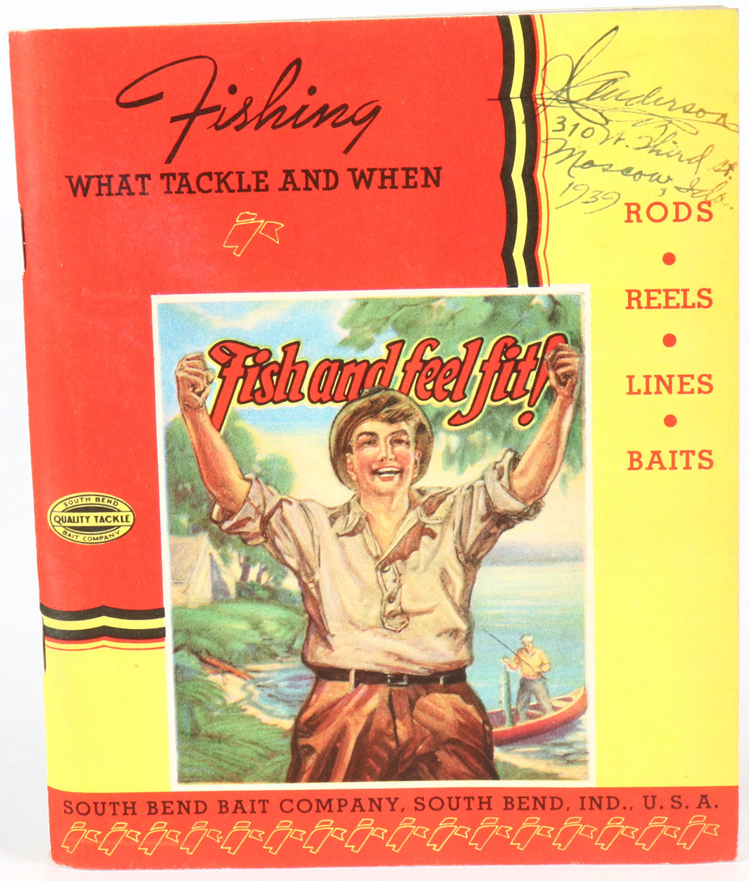 1939 South Bend Bait Co Fishing Tackle Pocket Catalog, full line catalog with 128 pages of items pictured, 5 1/2'' x 6 1/2'', great full color cover front & back, rods, reels & all lures. Grade: Excellent ++ - Value: 20 to 100
