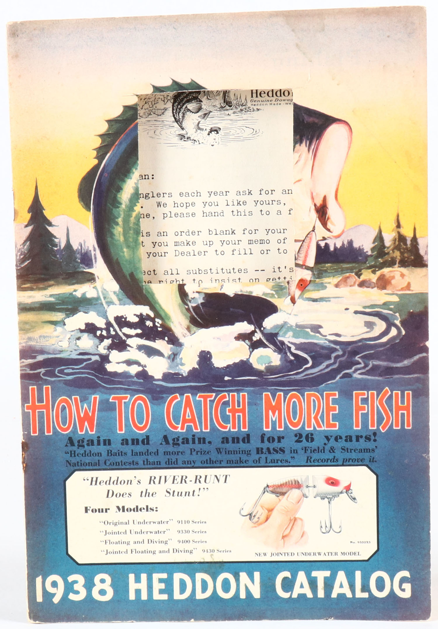 1938 Heddon Fishing Tackle Catalog, full line catalog with 40 pages of items pictured, 7'' x 10'', great color cover front & back, pictures rods, reels & all lures, many are in color, has logo cut out of cover, cover has loosened from staples. Grade: Very Good - Value: 6 to 30