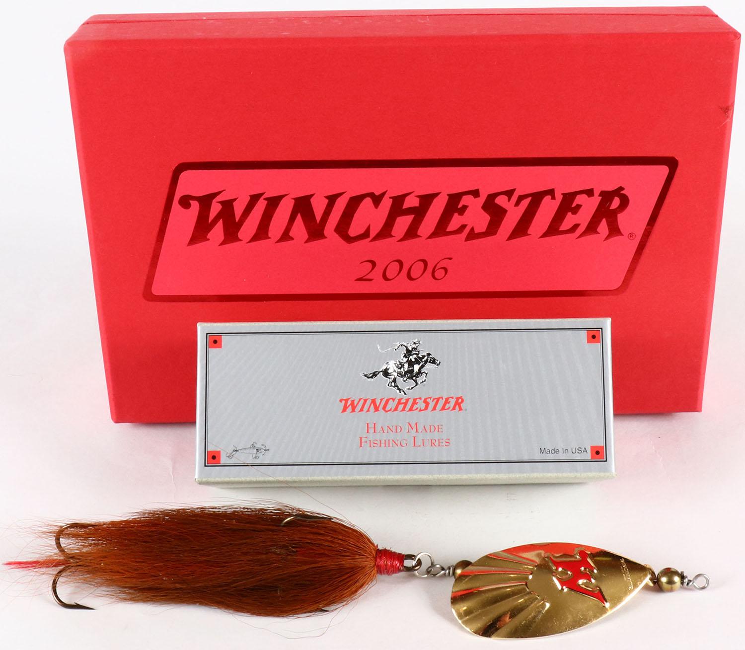 Full Case of Winchester lures, 9210 5 Hook Brown Crackleback, 2 Hook White Scale, 2 Hook Black/Silver Flash & a Gold Plated Fluted Troller spinner 2oz, inside lid of case has a great fishing scene label. Grade: MINT - Value: 100 to 400