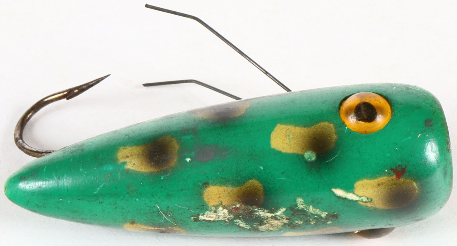 Unmarked Weedless wood lure, GE, frog pattern, single hook, 2 1/2''. Grade: Very Good - Value: 10 to 50
