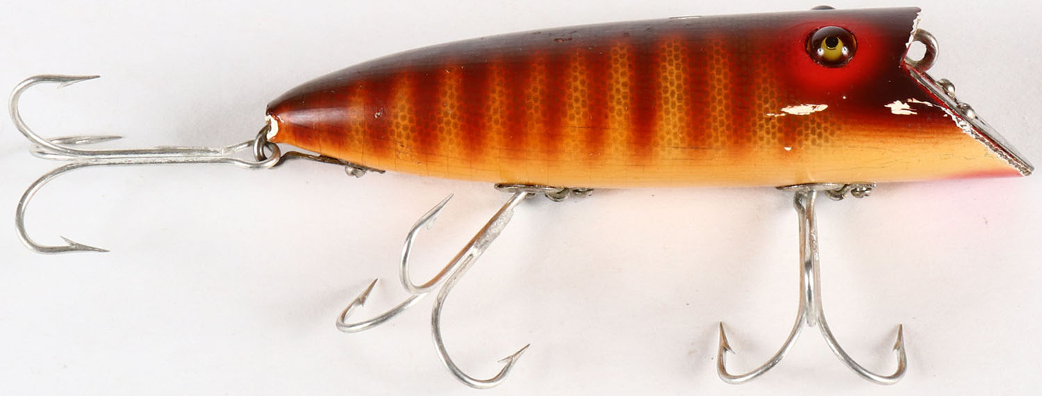 Heddon Basser, 3 hook wood lure, Goldfish finish, has glass eyes, L-rig, marked metal lip, light wear to paint. Grade: Excellent - Value: 20 to 50