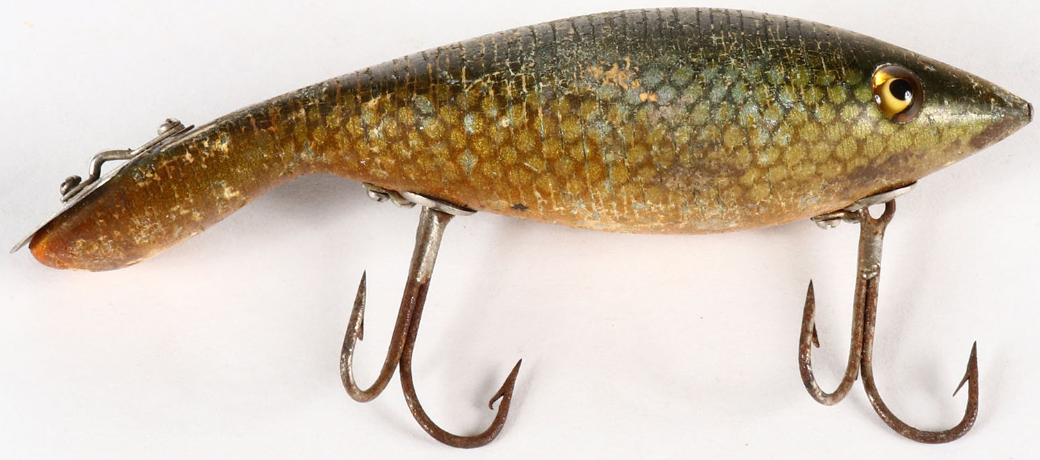 Heddon Dowagiac Tadpolly, 2 hook wood lure, Green Scale finish, has glass eyes, L-rig, marked metal lip, show wear to paint, 4 5/8''. Grade: Very Good - Value: 10 to 50