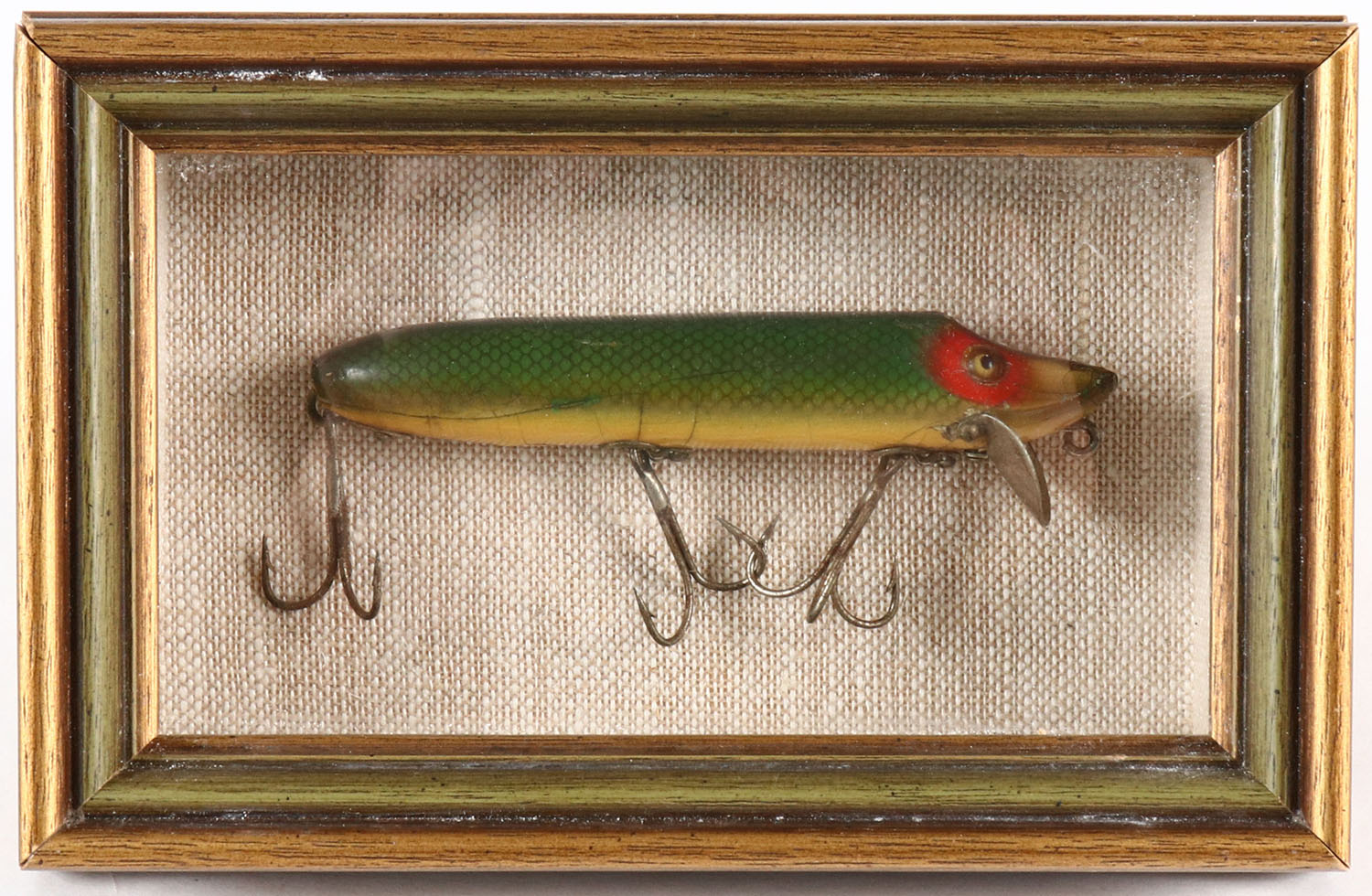 Heddon Vamp, wood lure, GE, green scale pattern, 3 hooks, L-rig, 4 3/8'', has some hair line cracks to paint, in a shadow box. Grade: Very Good ++ - Value: 10 to 40