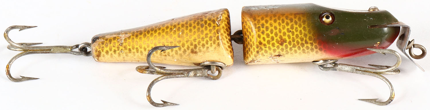 Creek Chub Jointed Pikie, gold shinner scale, wood lure, GE, 3 hooks, marked back, Cup rig, 4 1/2''. Grade: Very Good - Value: 6 to 30