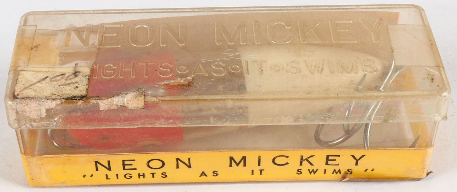 Neon Mickey lure in the orignal box, red & white. Grade: Excellent - Value: 6 to 30