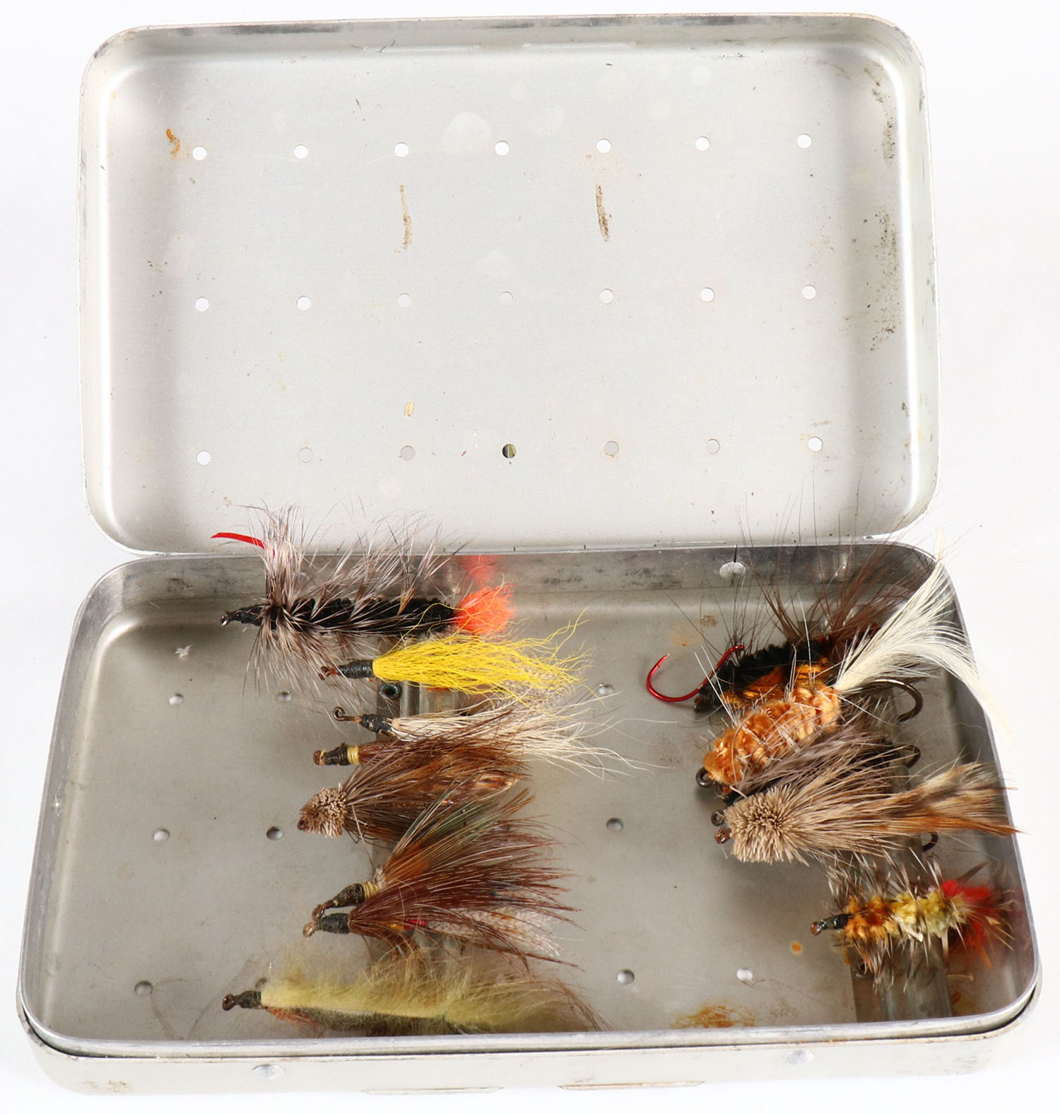 | Perring metal fly box with many larger flies. Grade: Excellent ...