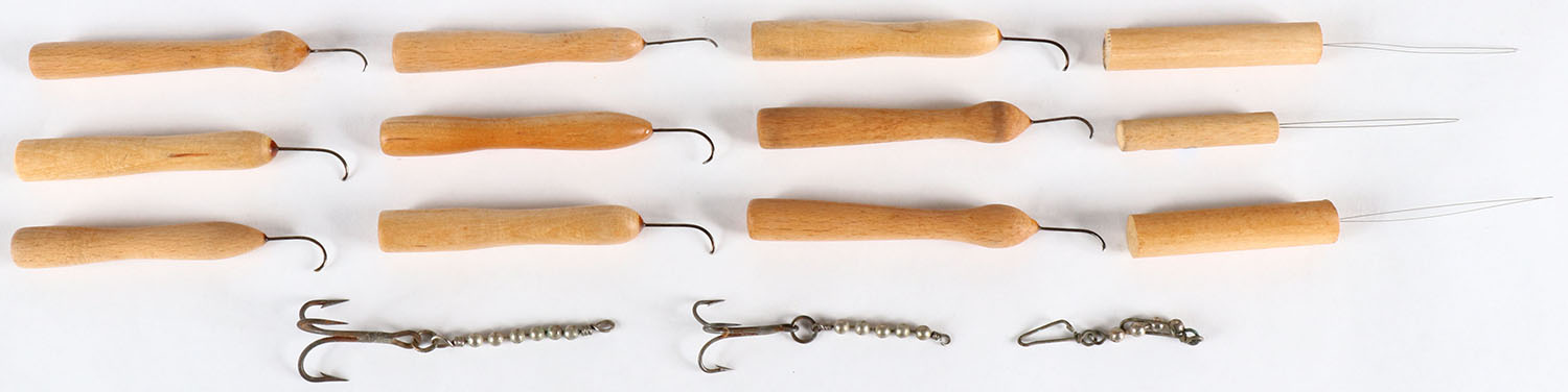 Lot of wood pieces with fish hooks to fine wire to help with tying hooks or fly tying?. Grade: Excellent - Value: 2 to 30