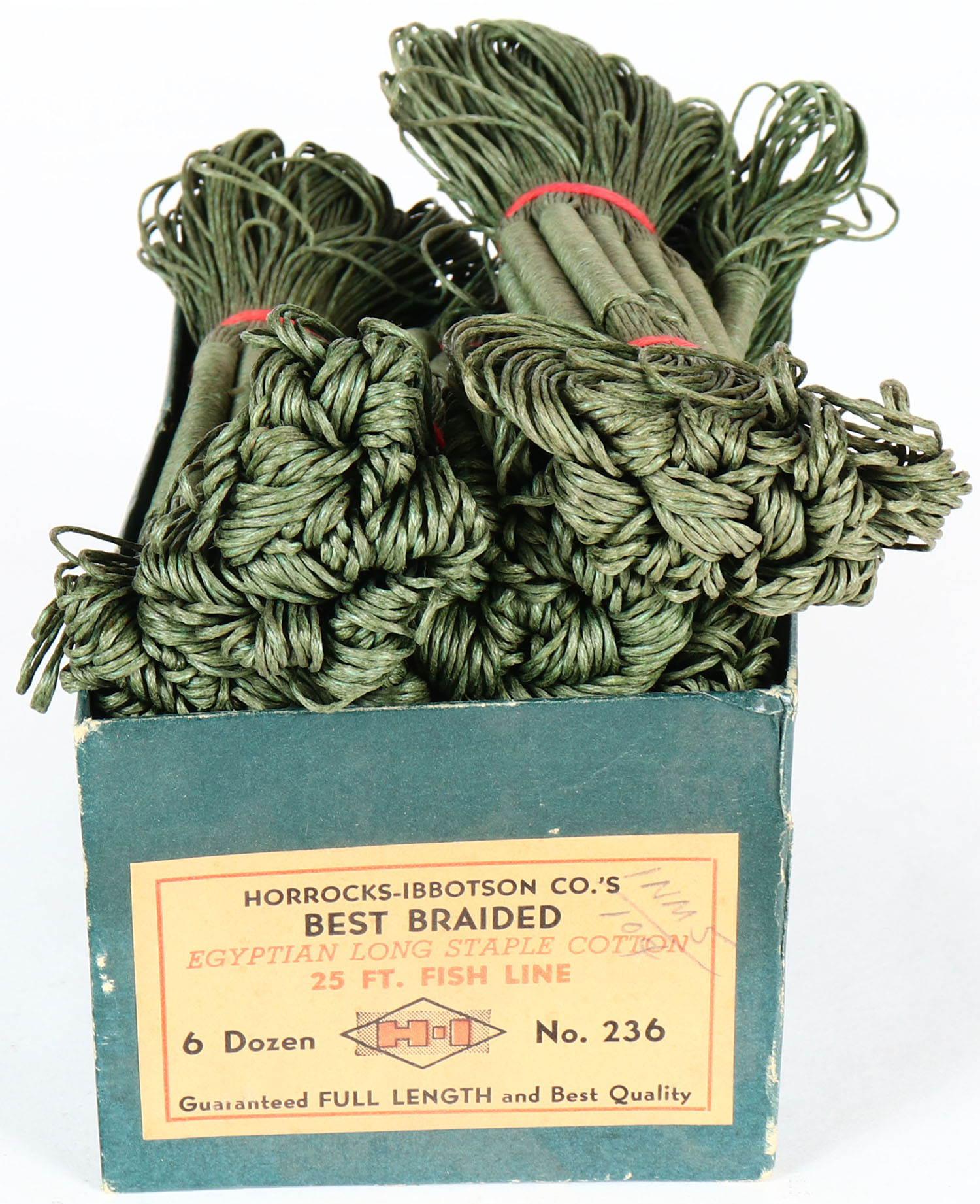Box of Horrocks-Ibbotson Best Braided Egyptian Long Staple Cotton 25ft. Fishing line, each bundle has 12 lines & this has 10 bundles, so 120 lines with box. Grade: Excellent - Value: 10 to 50