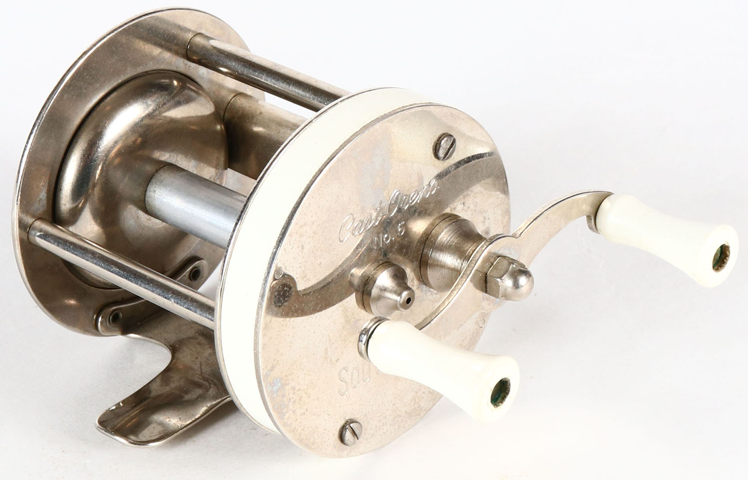 South Bend, CAST ORENO, No 5, level wind reel, dual white handles. Grade: Excellent ++ - Value: 10 to 50