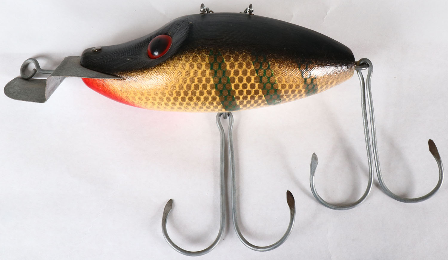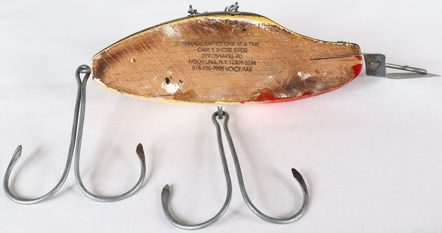 Large wood VAMP Sporting Goods store lure by Carl's Shore Birds, NY, lure is flat on the back sotted for wall mounting, beautiful original paint, 2 hooks, 12'' OAL, Grade: Excellent - Value: 20 to 100