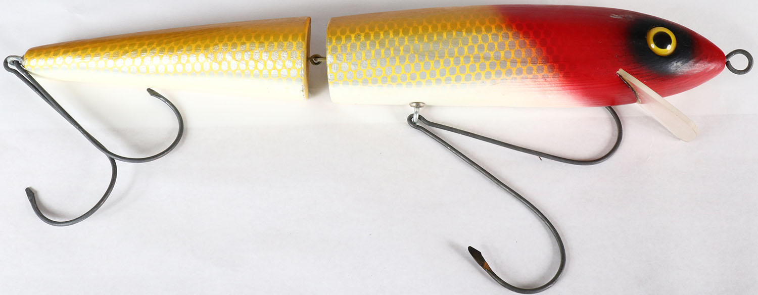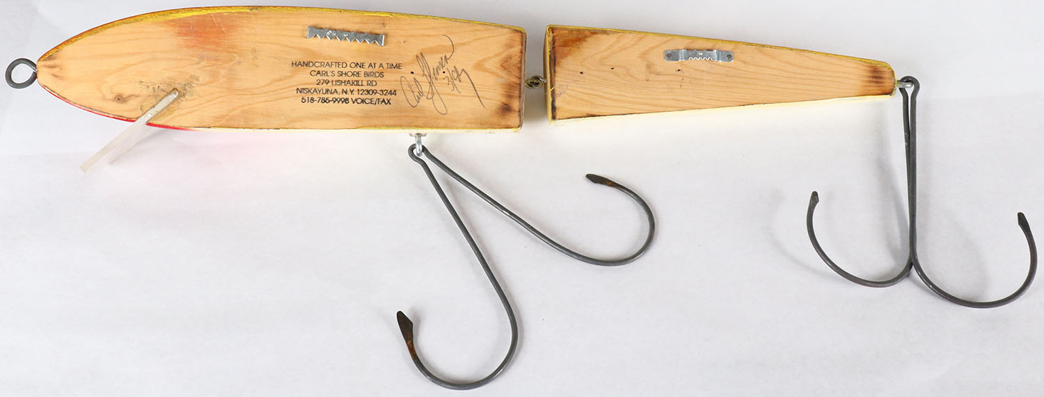 Large Jointed wood Sporting Goods store lure by Carl's Shore Birds, NY, lure is flat on the back sotted for wall mounting, beautiful original paint, 3 hooks, 23'' OAL, Grade: Excellent - Value: 20 to 100