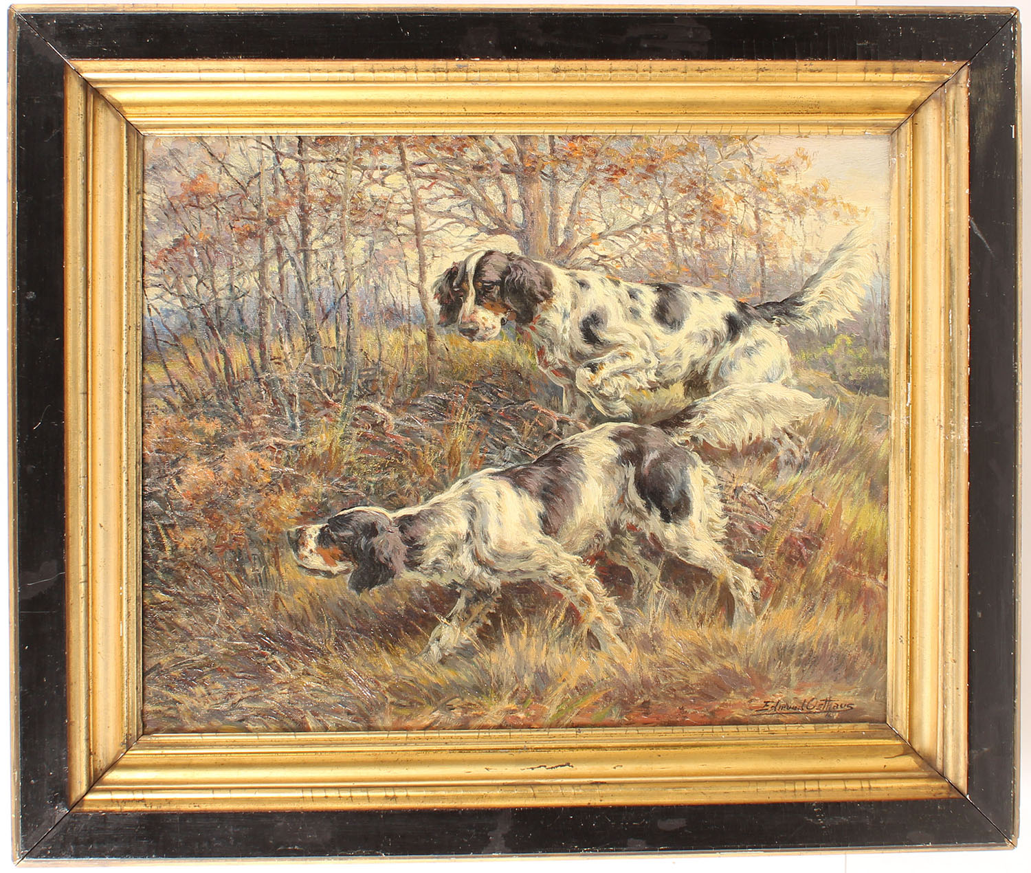 RARE Edmund Henry Osthaus (1858-1928) original oil on canvas, pictures a vivid color image of two English Setters on point, signed in lower right, image size 16'' x 20'', As viewed under black light image is very good and original; period frame has had some inpainting around black areas, framed, EXTREMALLY RARE & IMPORTANT PIECE OF AMERICAN ART HISTORY! Grade: Excellent - Value: 10000 to 30000