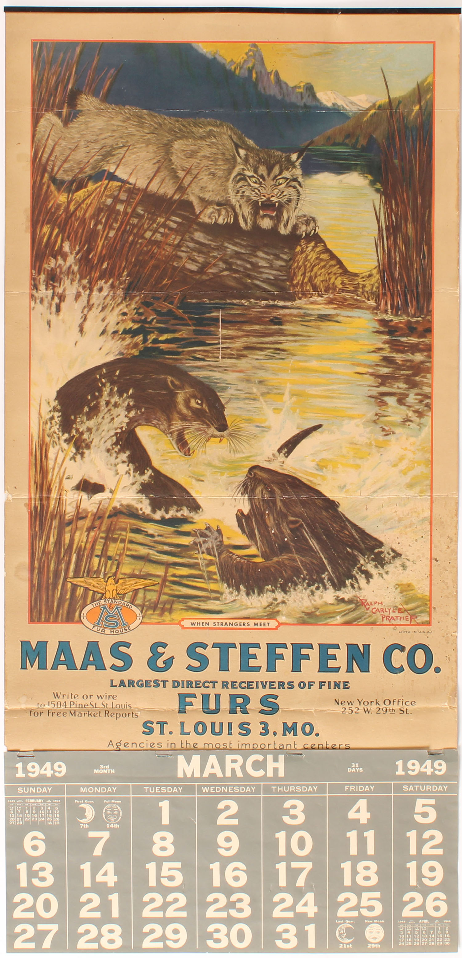 Maas & Steffen 1949 Calendar, ''WHEN STRANGERS MEET'', pictures lynx's, beaver & nutria attacking each other, 13 1/2'' x 27 1/2'', has original band with paper hanger, shows an age spot to lower right otherwise nice colors, has fold mark in middle, Mar. page. Grade: Very Good + - Value: 300 to 600
