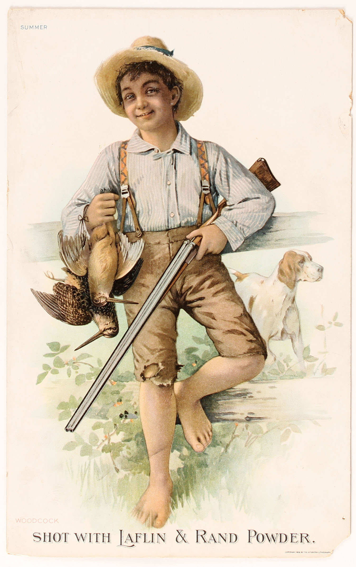 Laflin & Rand Powder Diecut, WOODCOCK, Summer, pictures a full color image of boy holding two woodcock with double shotgun with his dog in the background, dated 1908, has chip to bottom right corner. Grade: Excellent - Value: 50 to 250