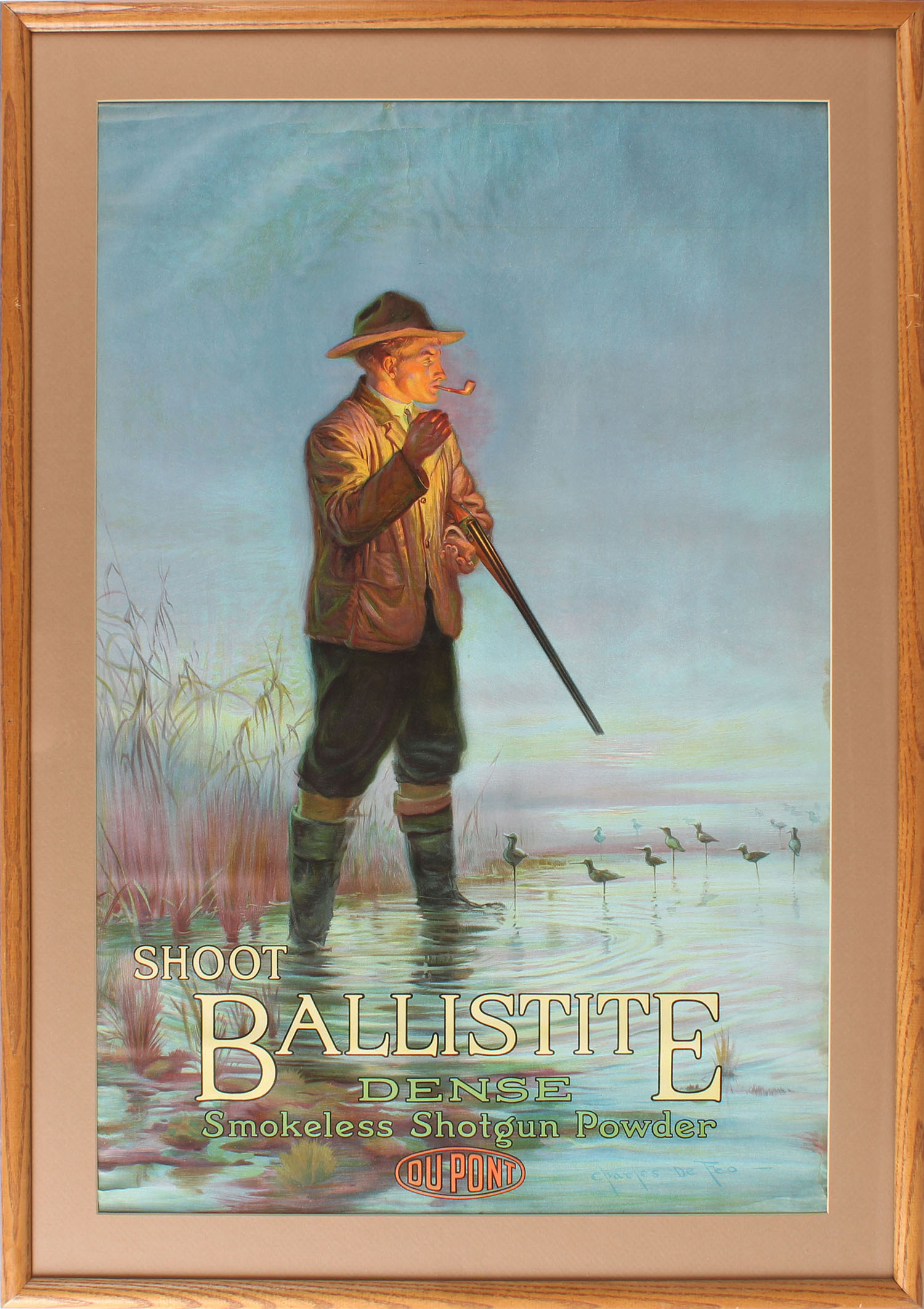 RARE Ballistite Poster, ''SHOOT BALLISTITE DENSE SMOKELESS SHOTGUN POWER DU PONT'', beautiful full color image of Shorebird hunter at sunrise smoking a pipe with shorebird decoys & holding a double shotgun, artist Charles De Foe, colors are fantastic, has original brass bands top & bottom with hanger, 19 1/2'' x 29 1/2'', has a very small hole to top center with a couple of light roll wrinkles, framed, VERY RARE & FIRST ONE WE HAVE OFFERED! Grade: Excellent + - Value: 5000 to 8000