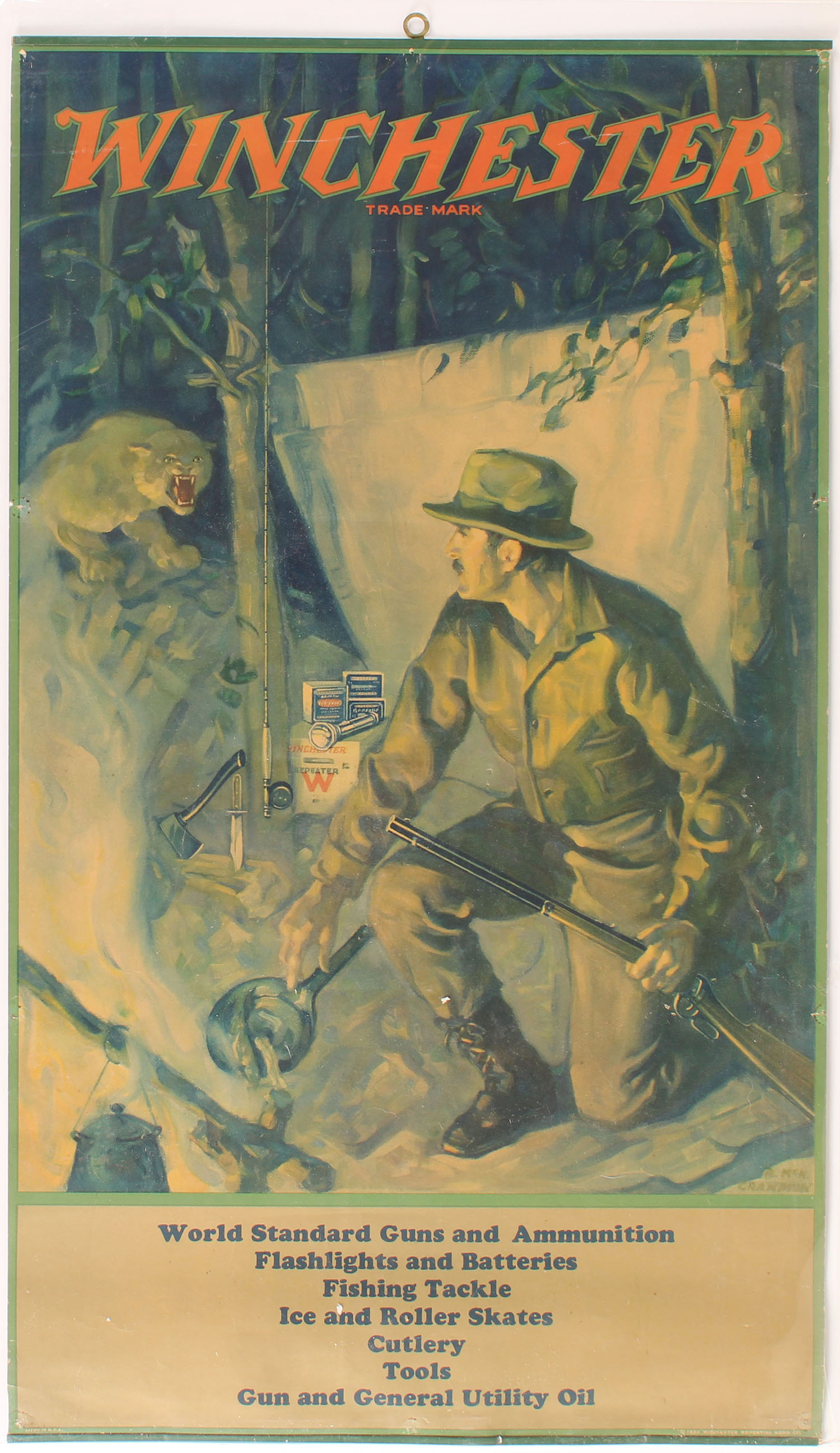 1930 Winchester Poster ''WINCHESTER WORLE STANDARD GUNS and AMMUNITION'' by Crampton, pictures hunter by campfire at night holding a model 94 with a cougar on the attack, has bands top & bottom with brass hanger, 15'' x 25 3/4'', very nice colors with almost no edge wear, RARE & HARD TO FIND! Grade: Excellent - Value: 2000 to 4000