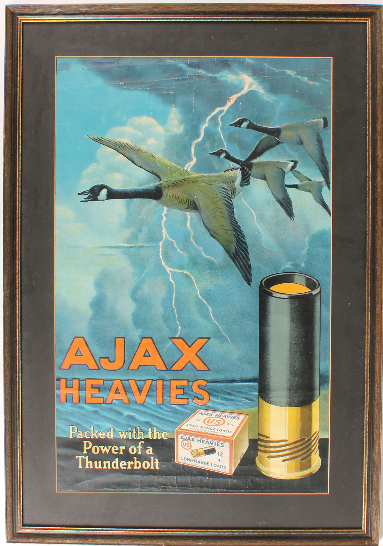 RARE US Cart Co. Poster, pictures the LIGHTING BOLT Storm with AJAX Heavies 2pc box, ''AJAX HEAVIES, PACKED WITH THE POWER OF A THUNDERBOLT'', no bands, 20 1/8'' x 30'', 100% all original, has wrinkles to top & bottom with two small holes to top, framed, ONLY THE SECOND WE HAVE EVER SEEN! Grade: Very Good ++ - Value: 1000 to 3000