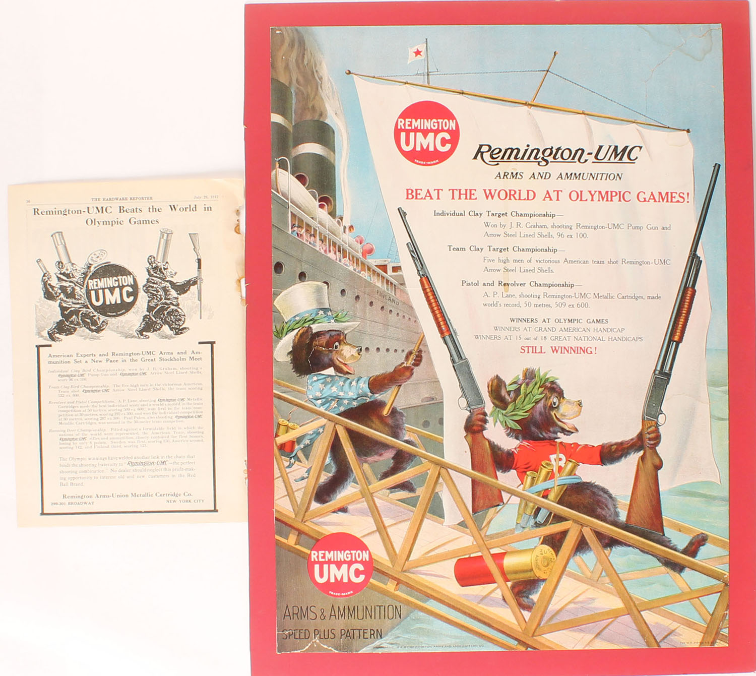 Exceedingly Rare Remington UMC BEARS Poster, 1912 SUMMER OLYMPICS promotion poster that let everyone know Remington UMC beat the world at the Summer Olympics in Sweden, larger than life image of the two Remington Bears holding a rifle & shotgun coming off the large steam ship in background, has large shotshells & cartridges, no bands, 16'' x 22'', includes one advertisement piece out of a magazine that pictures the two bears, has tears to top right, middle left & bottom left, one water stain to top right, but the colors are so vivid its like the poster has not seen the light of day, WE BELIEVE THIS TO BE THE ONLY ORIGINAL KNOWN! Grade: Very Good ++ - Value: 1000 to 5000